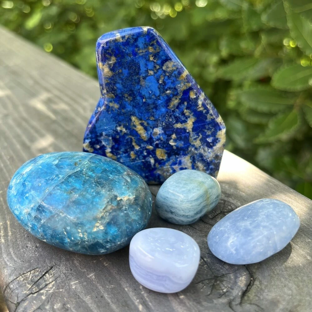 De kleur blauw staat in verbinding met het keelchakra (5e chakra), wat staat voor jezelf uitspreken, duidelijk zijn en ook met het reguleren van emoties. Blauwe edelstenen zorgen veelal voor kalmte en rust. Ze nodigen je uit je ruimte in te nemen en vanuit je basis de wereld in te kijken. Blauwe edelstenen zijn goed als je jezelf duidelijker wilt uitspreken in de wereld, maar ook als je meer rust en ruimte in je emoties en gevoel wilt ervaren. Daarnaast nodigen ze je uit om je energie helder en je frequentie hoog te houden.