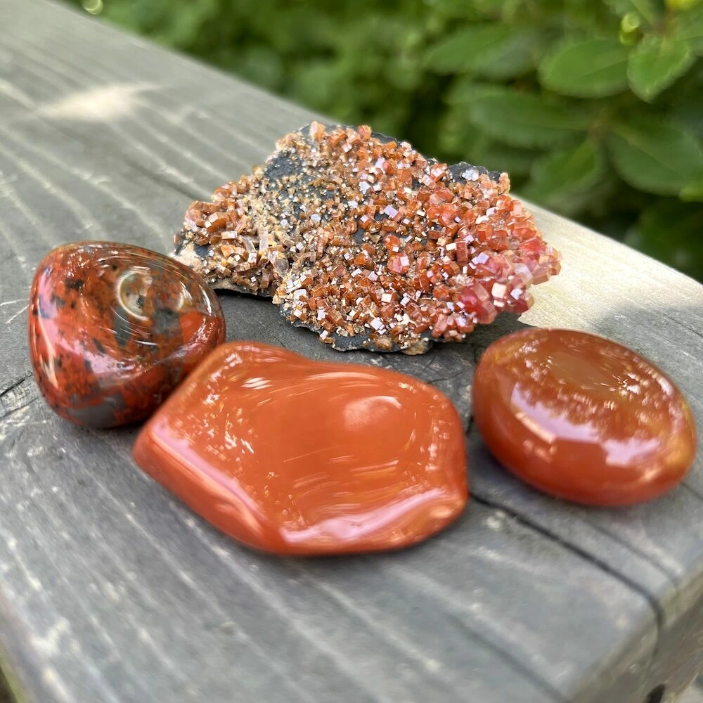 Voorbeelden van rode edelstenen zijn de rode jaspis, donkere carneool, vanadiniet, thuliet, robijnen en granaten.