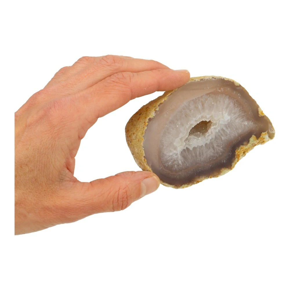 In geodevorm is agaat vaak gecombineerd met bergkristal. Hierdoor zuivert het de energie in de ruimte en nodigt het je uit om te ontspannen. Je ‘zakt’ makkelijker in je lichaam en de inwendige spanning vermindert. Ook geeft de agaat geode een positieve stemming en helpt om de energie ‘schoon’ te houden. Hierdoor is een agaat geode een fijne toevoeging in ieder interieur.
