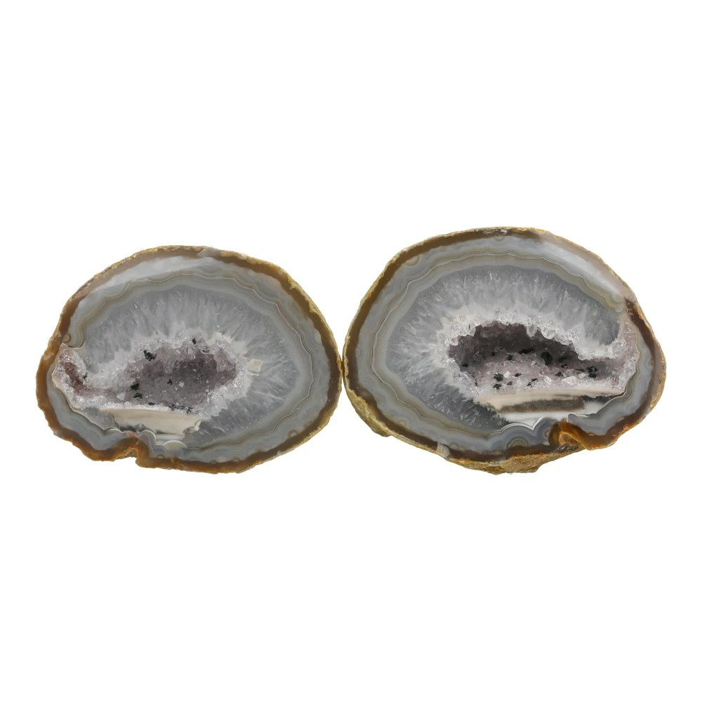 Mooi gepolijste agaat geode paar ‘nr8’ uit Brazilië. Deze agaat geode, oftewel holle steen is gehalveerd en de randen zijn gepolijst. Je ontvangt het agaat geodepaar van de foto, deze is puur natuur en niet bijgekleurd. Deze gaat heeft een bijzonder patroon van lichtblauw en grijs, lichte amethist en met stippen. De energie is uitnodigend en liefdevol, fijn voor sensitieve mensen. De afmeting is ongeveer 6,3cm hoog en 8,2cm breed. De diepte van het ene deel is 4,3cm en van het andere deel 6,9cm. Een fraai paar voor in ieder interieur om de ruimte met fijne energie te vullen.