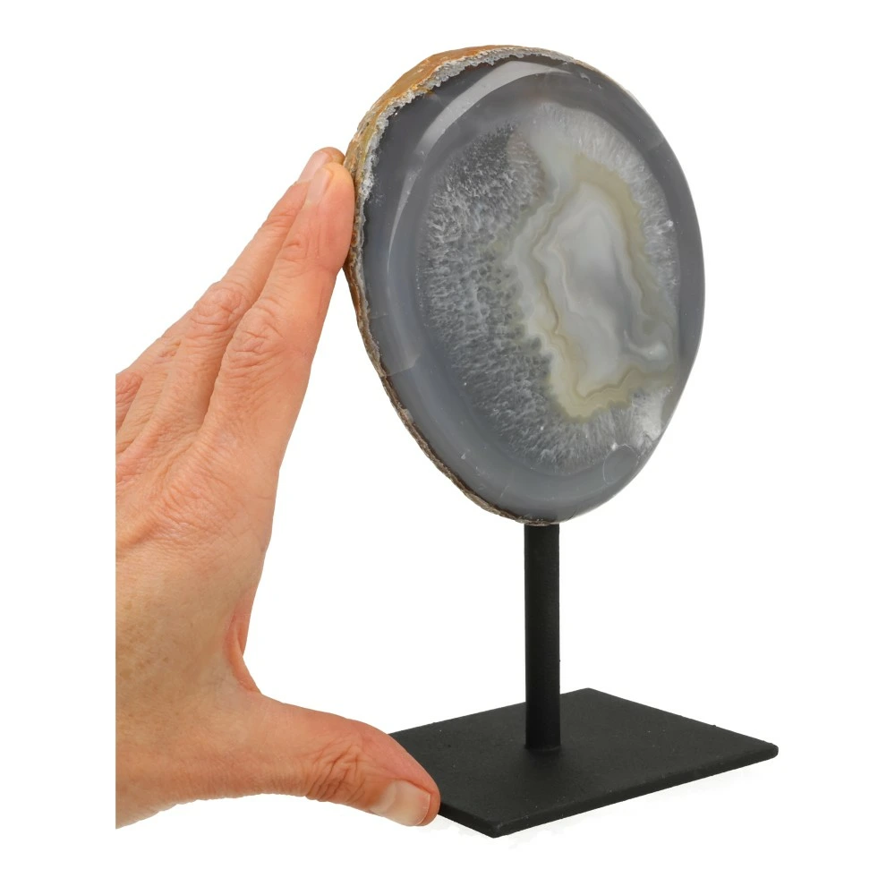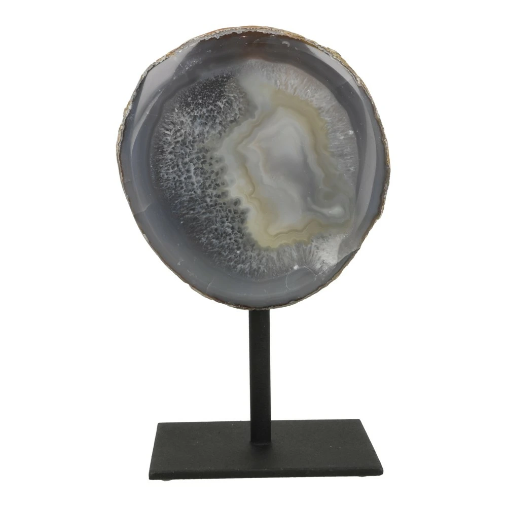 Mooie gepolijste halve agaat geode op standaard ‘G’ uit Brazilië. Deze agaat geode, oftewel holle steen is gehalveerd en de randen zijn gepolijst en op een zwart metalen standaard gezet. Je ontvangt de agaat geode van de foto, deze is puur natuur en niet bijgekleurd. Deze bijzondere grijze agaat is enigszins transparant en heeft een interessante opvulling van agaat met subtiele tekening. Fijn stuk met heerlijk zachte energie. De afmeting is ongeveer 20cm hoog, waarbij de agaat 15,5cm hoog is. De agaat is 12cm breed en bijna 4cm dik. Fraai stuk voor in ieder interieur.