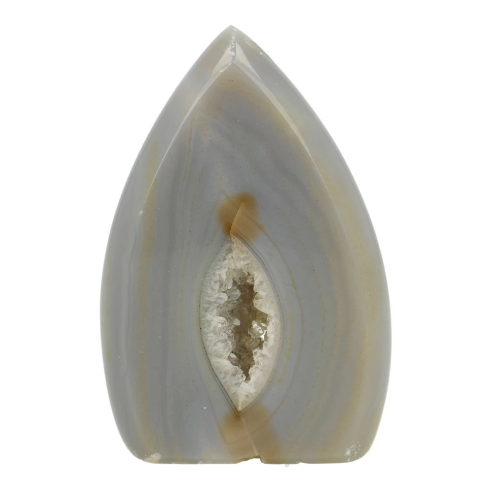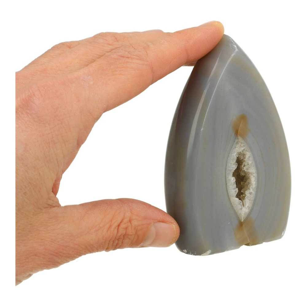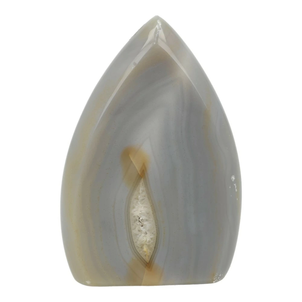 Mooie grijs-witte agaat vrije vorm met een holte en een hoogte van 93mm, een breedte van 62mm en en dikte van 21mm. Deze agaat vrije vorm heeft een fraai spel van kleuren en een bijzondere tekening door de bergkristal die in de holte is gegroeid. Een mooie gepolijste agaat, fijn om zachtjes zijn energie door de ruimte te verspreiden. Je ontvangt deze gepolijste agaat van de foto.