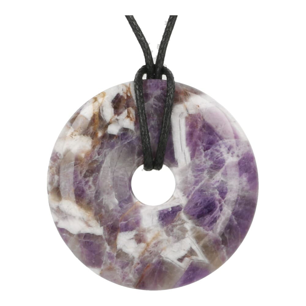 Fraaie donker paars gestreepte amethist donut hanger met zwart waxkoord. Je ontvangt een soortgelijke amethist donut hanger als op de foto. De afmeting van de donut is ongeveer 5cm diameter.