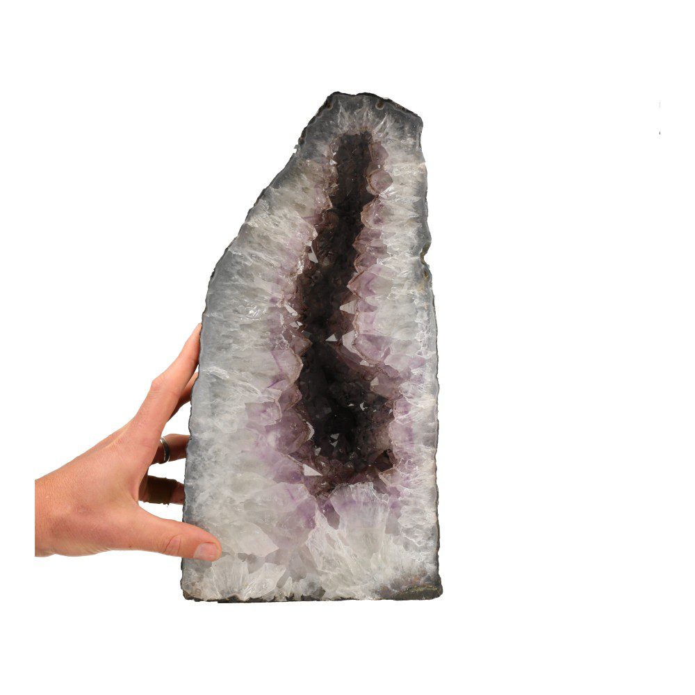 Lichte amethist geode met fijne bergkristal rand en bijzondere vorm uit Brazilië. Geodes zijn ideaal voor in (praktijk)ruimtes. Deze amethist geode is ruim 38 cm hoog, 19 cm breed en 12 cm diep en heeft een gewicht van 11,35 kg. Bijzonder is de ronde vorm van de holte, het stuk witte calciet, de paarse band in de kristallen en natuurlijk de lichte agaat rand. Deze geode heeft een stevige energie die diep op je buik-energie inwerkt. Nodigt je uit te staan voor jezelf en je wil zuiver in te zetten. Je ontvangt de amethist geode van de foto.