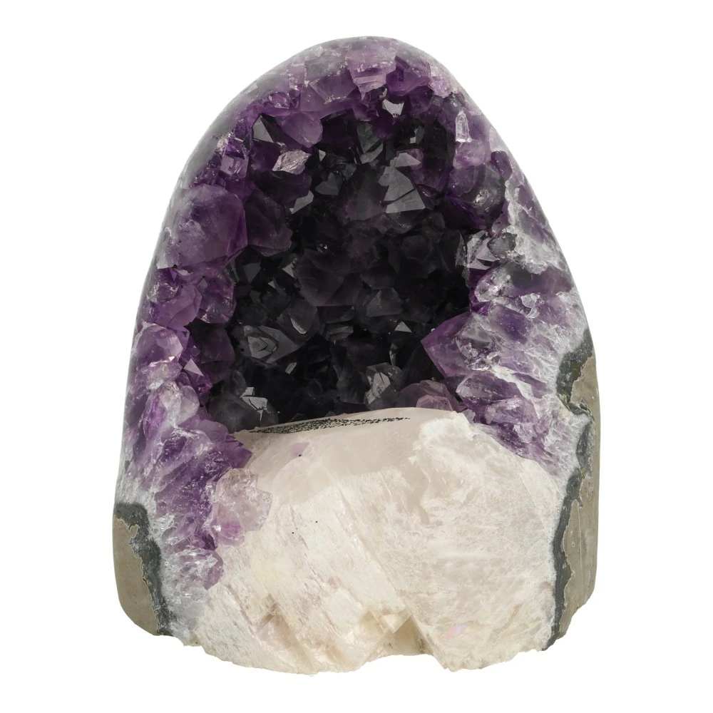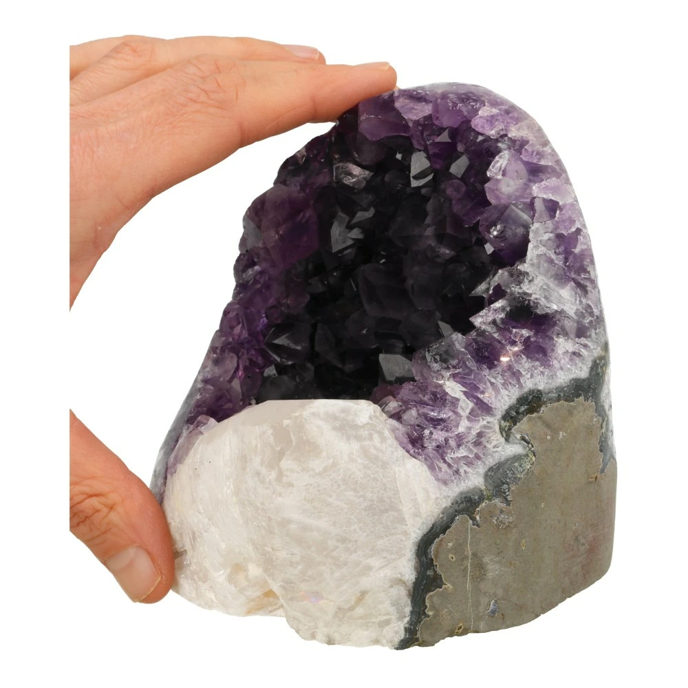 Prachtige donkerpaarse amethist zuil uit Uruguay met gepolijste randen en grote witte calciet met kleine hematiet in ruitvorm. Deze bijzondere, robuuste amethist straalt je tegemoet. De afmeting van deze A-kwaliteit amethist is ruim 12cm hoog, 11cm breed en 11cm diep. Je ontvangt uiteraard deze prachtige amethist van de foto.