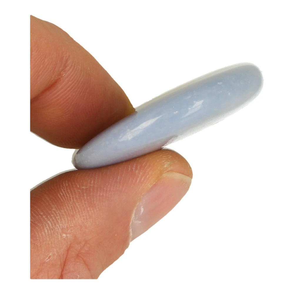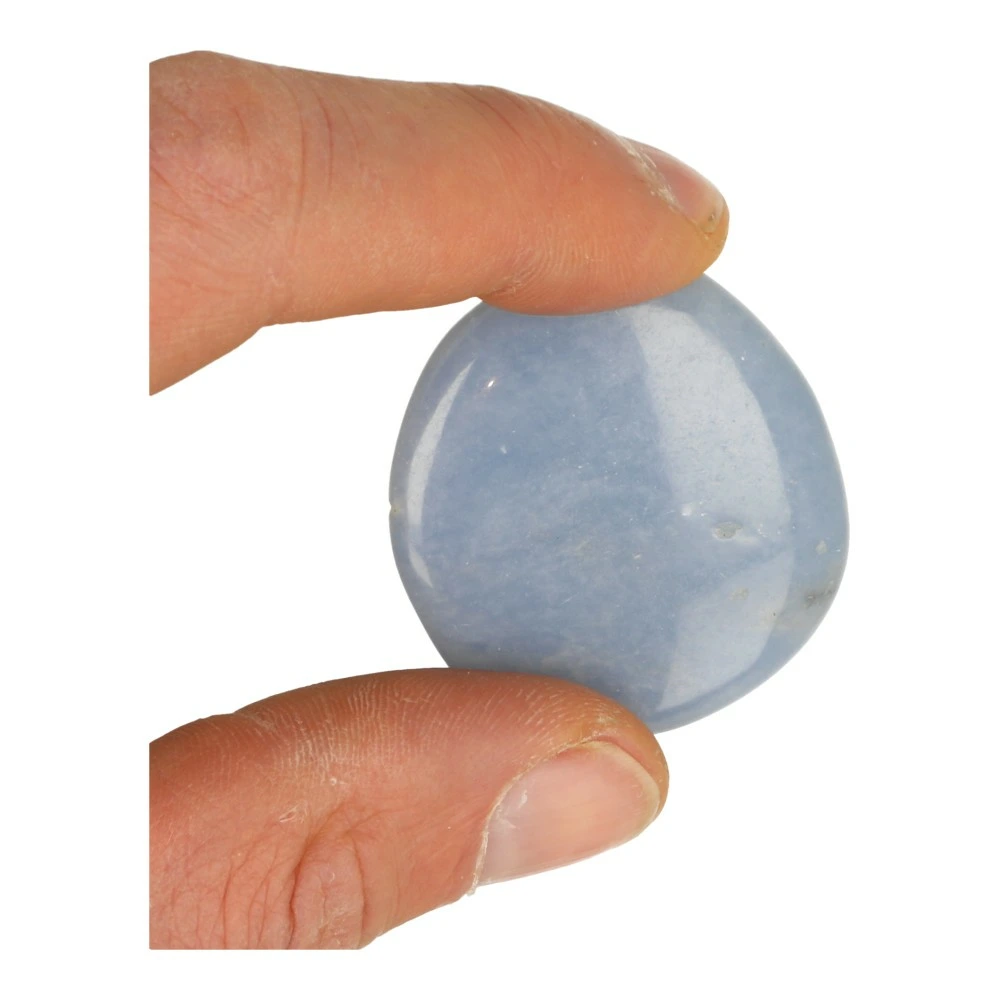 Fijne lichtblauwe angeliet zaksteen van circa 4-4,5cm lang, 3,5-4cm breed en 0,7-1cm dik. Je ontvangt een soortgelijke angeliet zaksteen als op de foto. Een zaksteen is een platte, glad gepolijste steen, die je fijn in je zak kan dragen. Deze vorm is ook zeer geschikt om te gebruiken bij edelsteen opleggingen.
