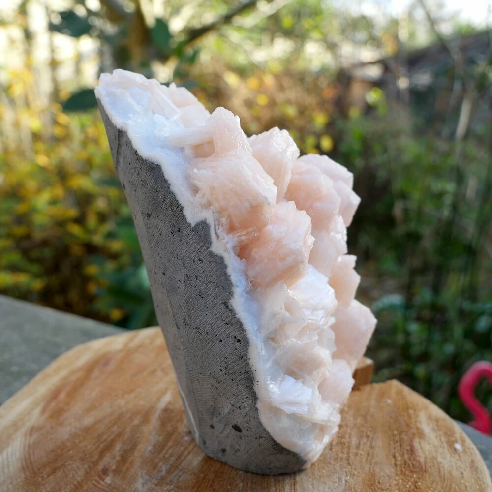 Bijzonder fraaie roze stilbiet op witte chalcedoon staande vorm ‘nr1’ uit India. Dit fraaie stuk met esthetische roze stilbiet kristallen, fraai gesitueerd op een basis van glimmende witte chalcedoon kristallen is een echte eye-catcher. Een bijzonder fraai en fijn stuk met lichte en liefdevolle energie. De afmeting van deze unieke stilbiet op chalcedoon is ongeveer 11cm breed, 14cm hoog en 7,5cm dik. Deze combinatie op chalcedoon komt niet veel voor en zeker niet in deze fraaie kwaliteit! Een echte aanwinst voor iedere ruimte! De onderkant is vlak gemaakt, zodat dit fraaie stuk zelfstandig kan staan.