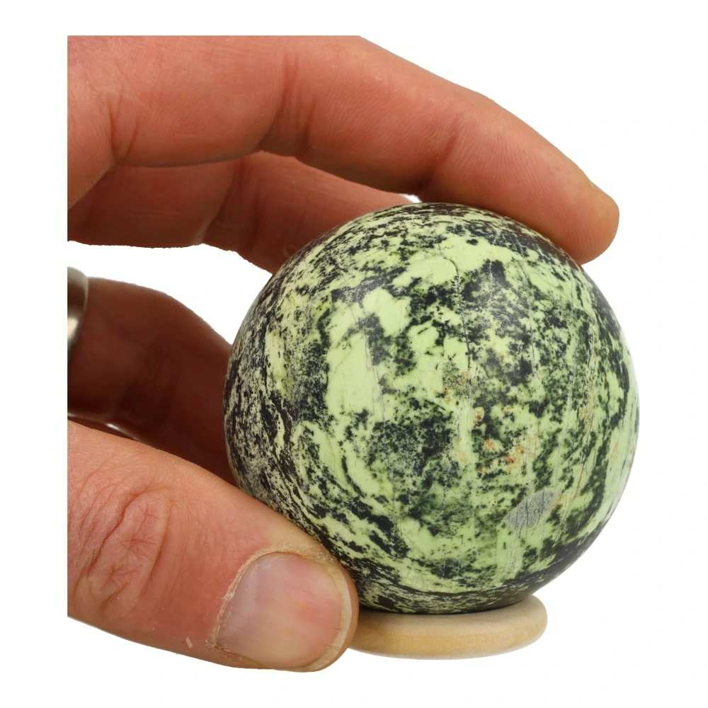 Fraai gemêleerde Australische groene opaal bol met donkere magnetiet en een diameter van 61mm op een houten ring. Je ontvangt de groene opaal bol van de foto.