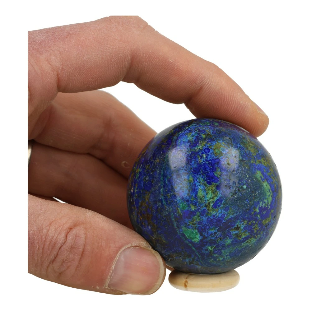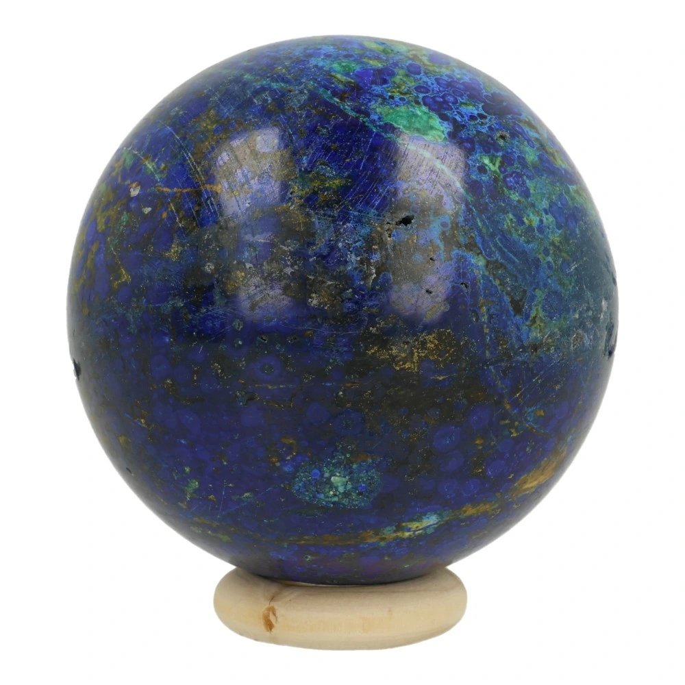 Helderblauwe A-kwaliteit azuriet met malachiet bol met diameter van ruim 52mm op houten ring. Deze fraaie bol bestaat uit een mix van azuriet (donkerblauw) en malachiet (groen). Azuriet is het meeste aanwezig, dus voert de boventoon in de werking. Voor de volledigheid zijn zowel de werking van azuriet als malachiet hieronder weergegeven. Je ontvangt uiteraard de azuriet bol van de foto.