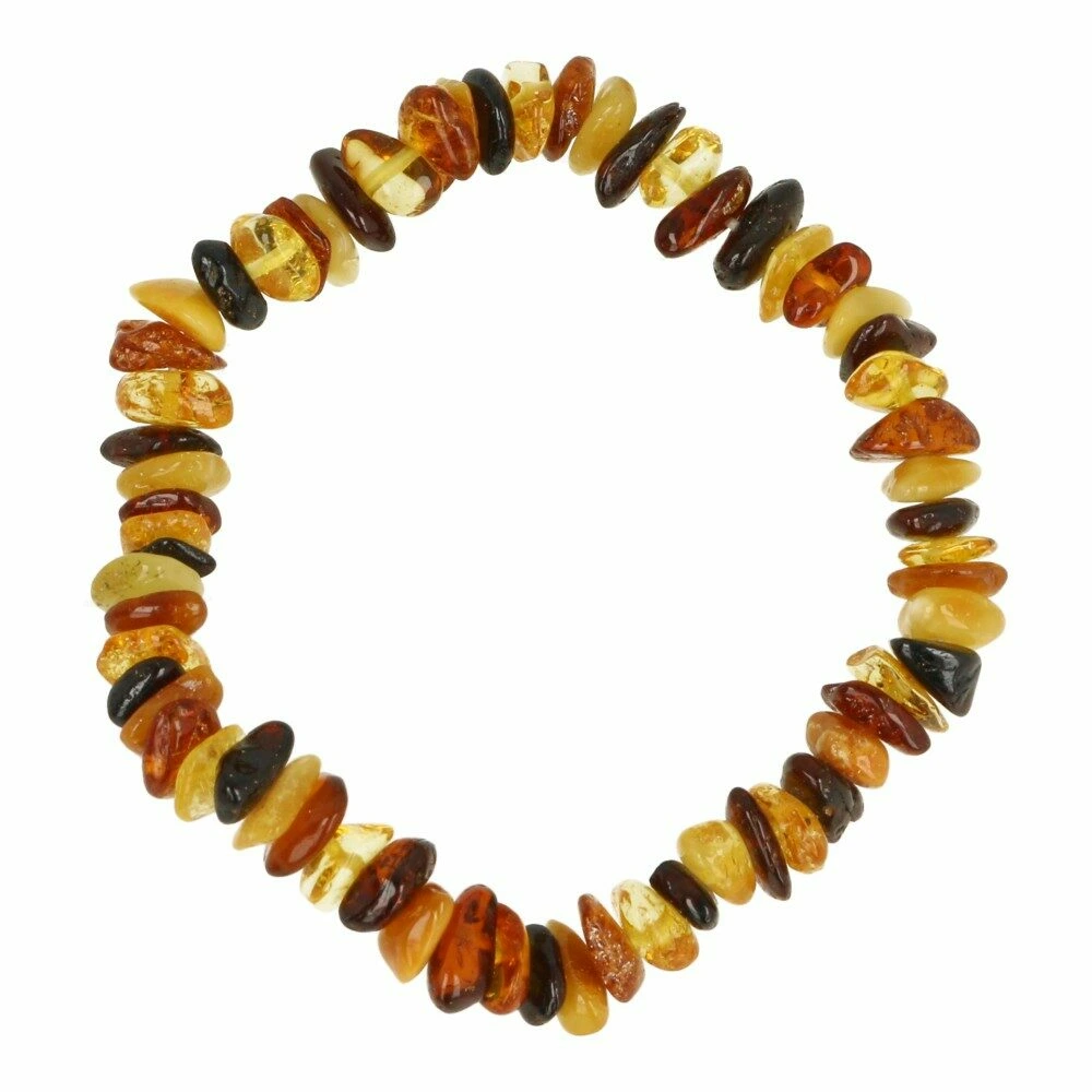 Mooie barnsteen armband split met verschillende kleuren barnsteen. Deze barnsteen armband split bestaat uit kleine stukjes gladde barnsteen in kleuren van lichtgeel tot donkerbruin. De barnsteen armband geregen op rekbaar koord en past bij een polsomtrek van 16-17cm.