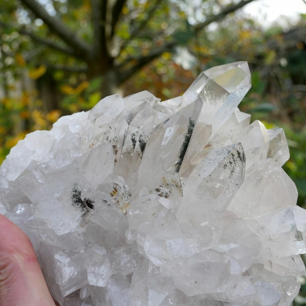 Mooi stuk ruwe bergkristal met chloriet uit de Himalaya. Dit fraaie stuk zit vol met lange en heldere kristallen. De afmetingen zijn ongeveer 19 cm breed, 16 cm diep en 9,5 cm hoog. Ongeslepen en puur natuur! Een aantal kristallen bevatten donkergroene chloriet in wolkjes door de heldere bergkristal, waardoor de helderheid wordt geaccentueerd. Dit stuk heeft een zeer warme en heldere energie die je omhult en jouw eigen waarheid en flow versterkt. Ze stimuleert je om lekker in je eigen energie te zijn en te genieten van jouw pure zelf. Een bergkristal cluster van prachtige kwaliteit en een energie die je tegemoet straalt!