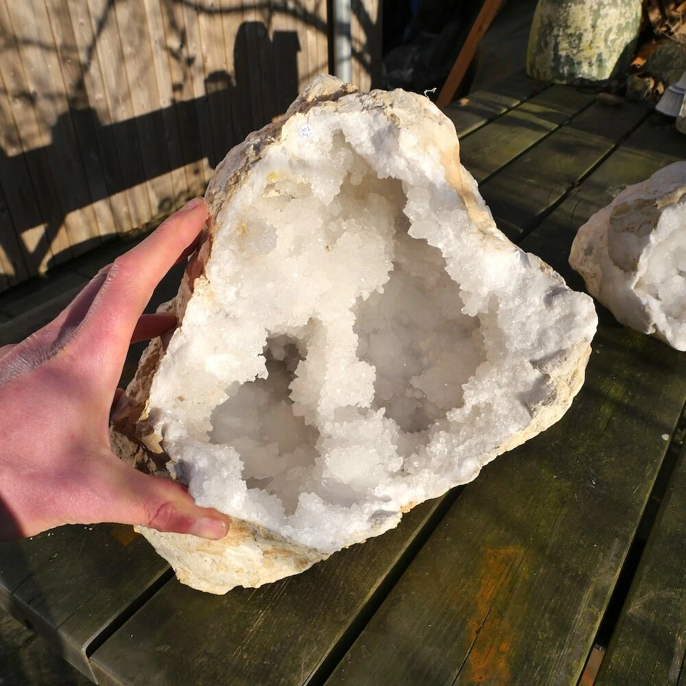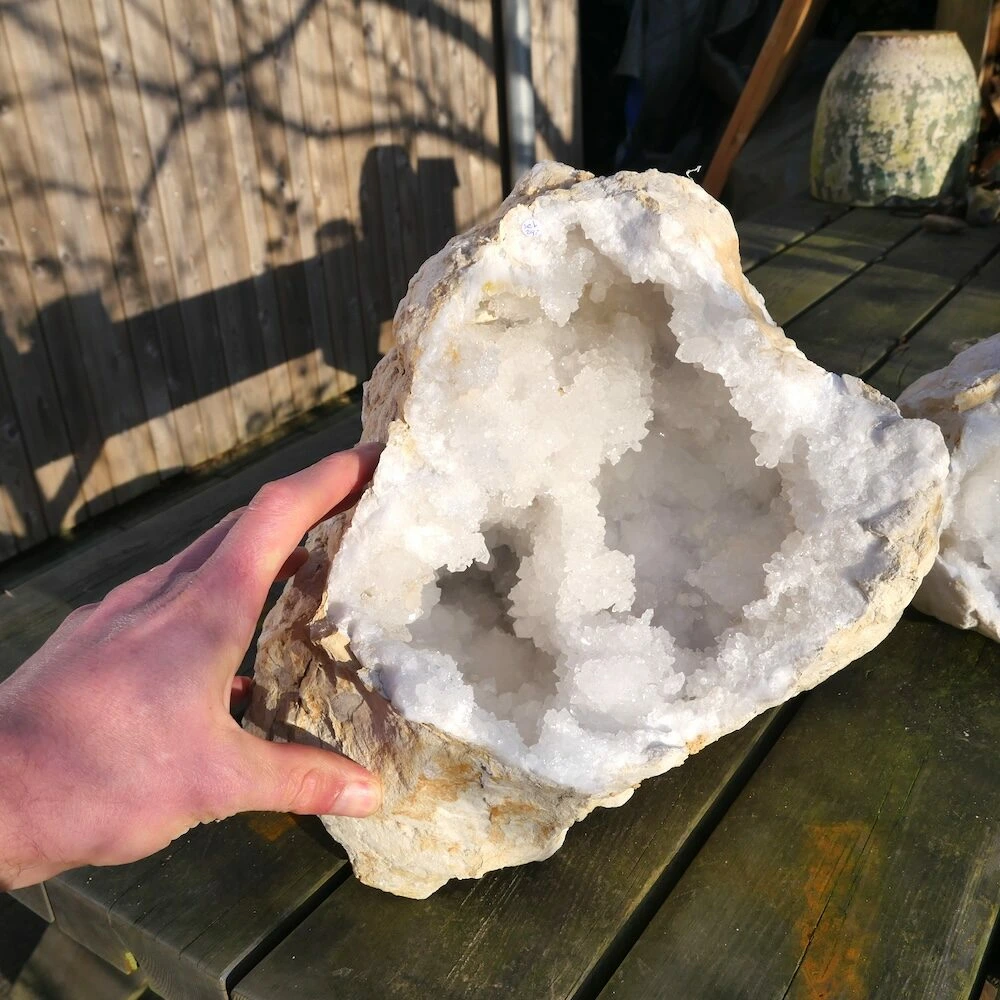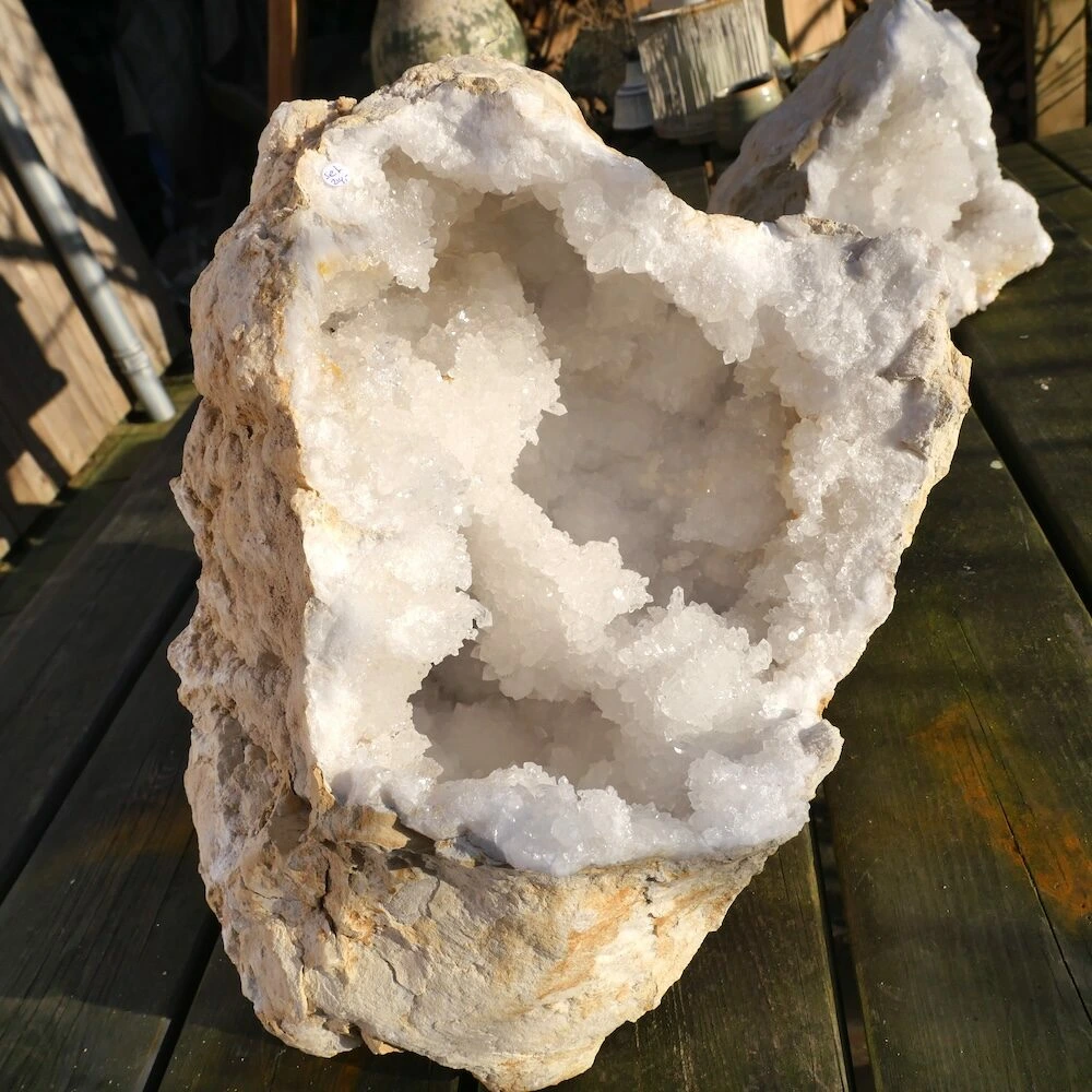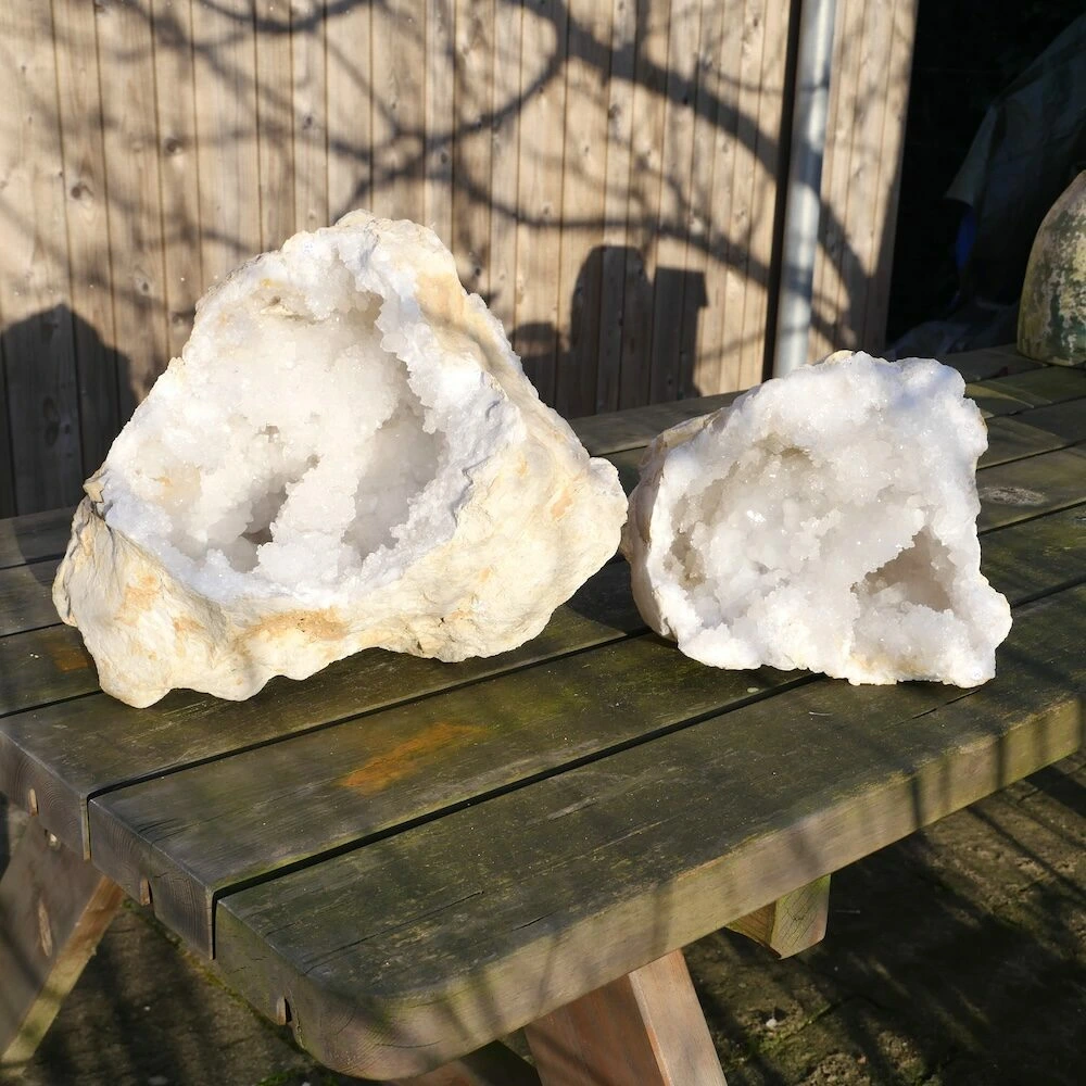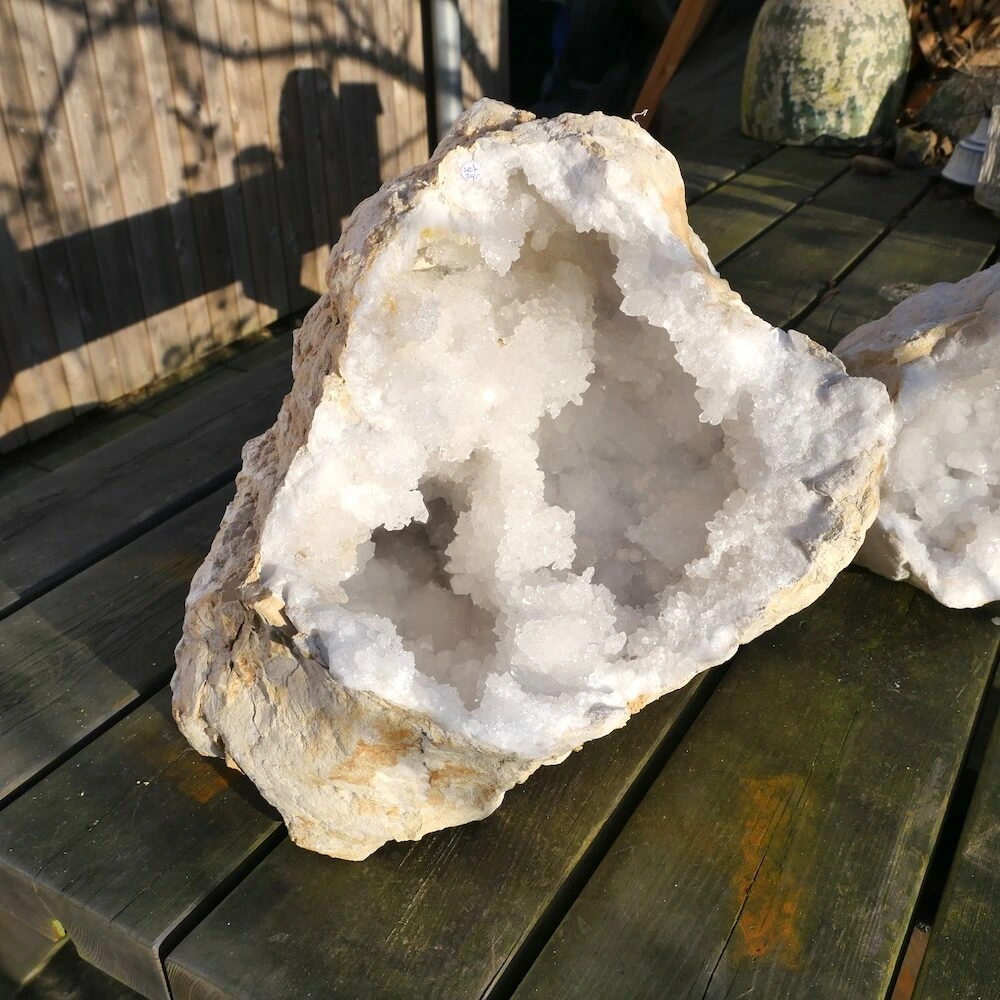 Fraaie grote bergkristal geode XL ‘nr1’ van 24kg! De afmeting van het groter deel van dit bergkristal geodepaar is ongeveer 32cm breed en 25cm hoog. De dikte van dit deel is ongeveer 24cm. Het kleinere deel heeft een afmeting van ongeveer 21 x 20cm en is 16cm dik. Beide delen kunnen mooi rechtop staan en hebben fraaie heldere kristallen vanbinnen. Het kleinere deel heeft ook een kleine opening aan de achterzijde. Je ontvangt het bergkristal geodepaar van op de foto, dus twee stukken die op elkaar passen. Deze bergkristal geode (holle steen) komt uit Marokko.