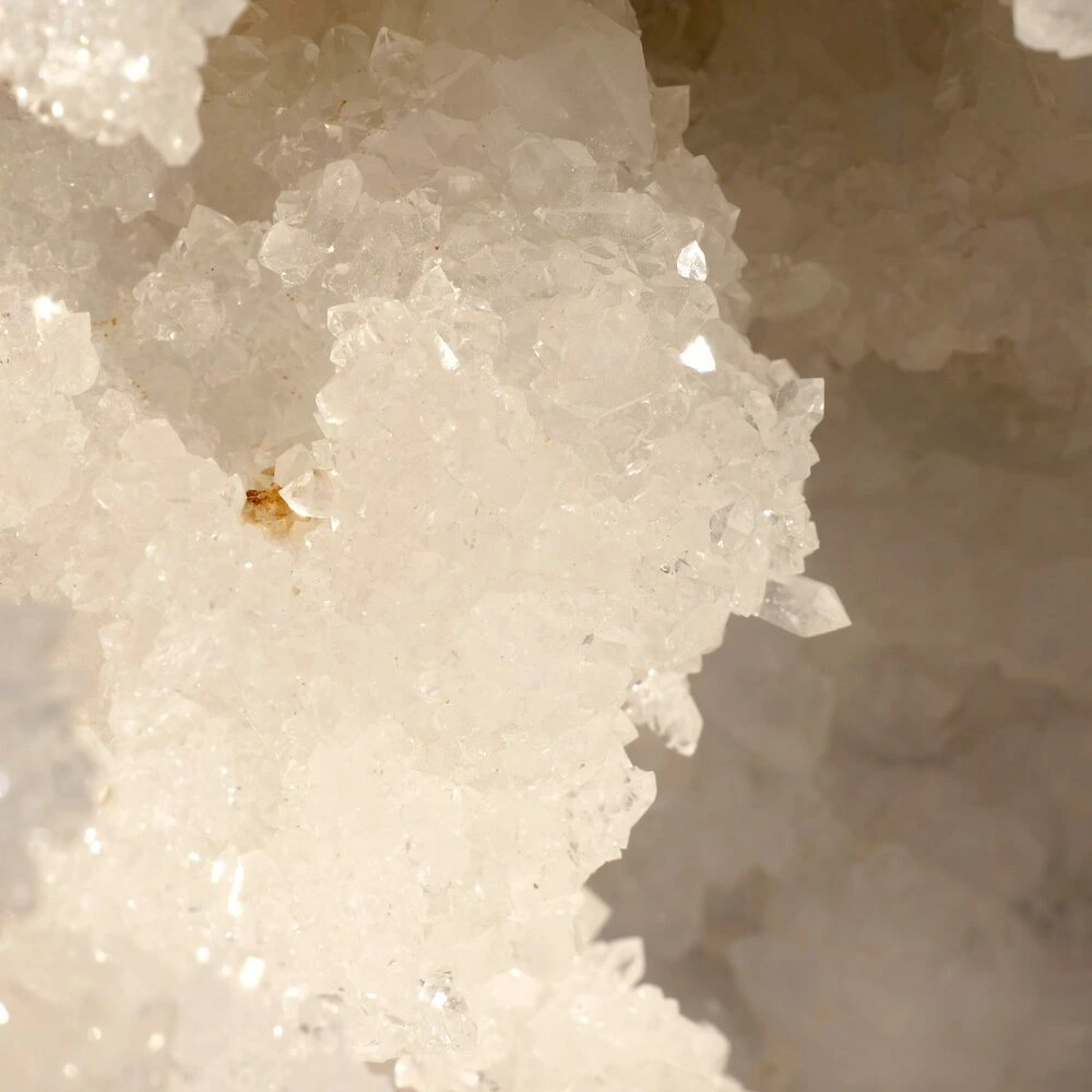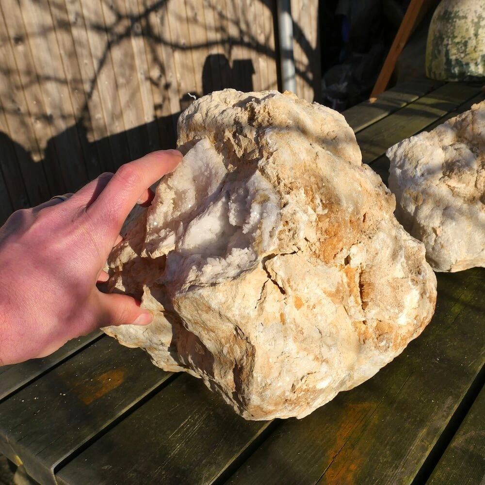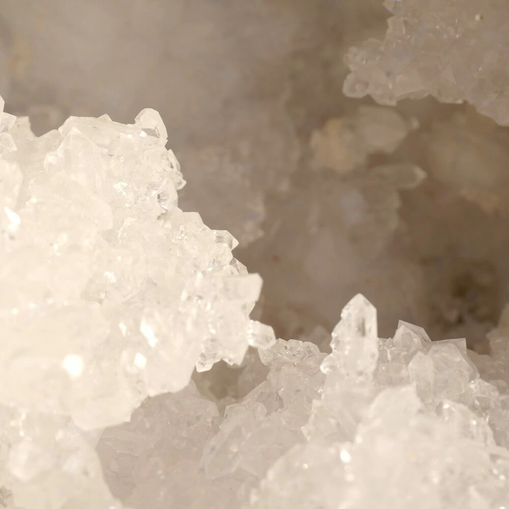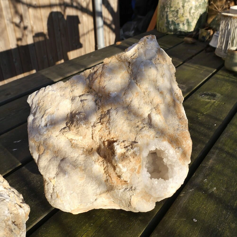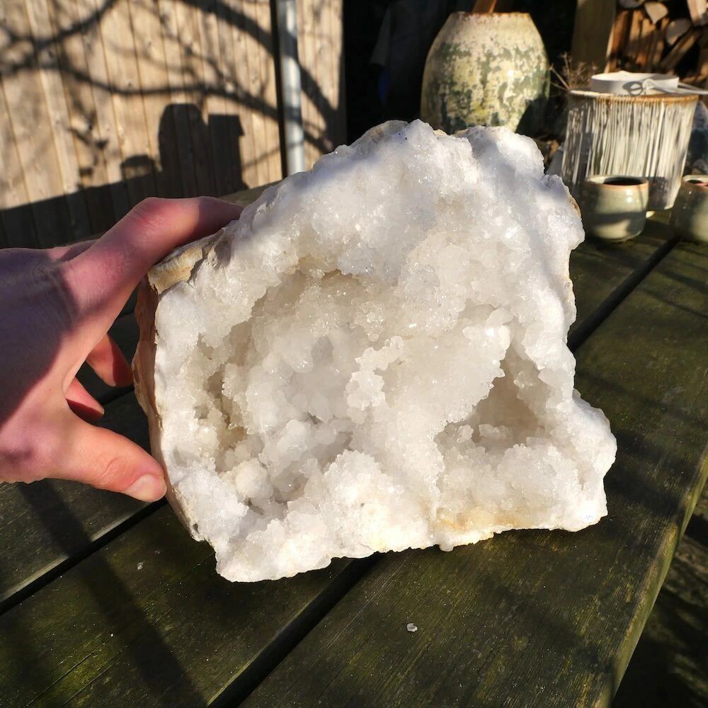 Fraaie grote bergkristal geode XL ‘nr1’ van 24kg! De afmeting van het groter deel van dit bergkristal geodepaar is ongeveer 32cm breed en 25cm hoog. De dikte van dit deel is ongeveer 24cm. Het kleinere deel heeft een afmeting van ongeveer 21 x 20cm en is 16cm dik. Beide delen kunnen mooi rechtop staan en hebben fraaie heldere kristallen vanbinnen. Het kleinere deel heeft ook een kleine opening aan de achterzijde. Je ontvangt het bergkristal geodepaar van op de foto, dus twee stukken die op elkaar passen. Deze bergkristal geode (holle steen) komt uit Marokko.