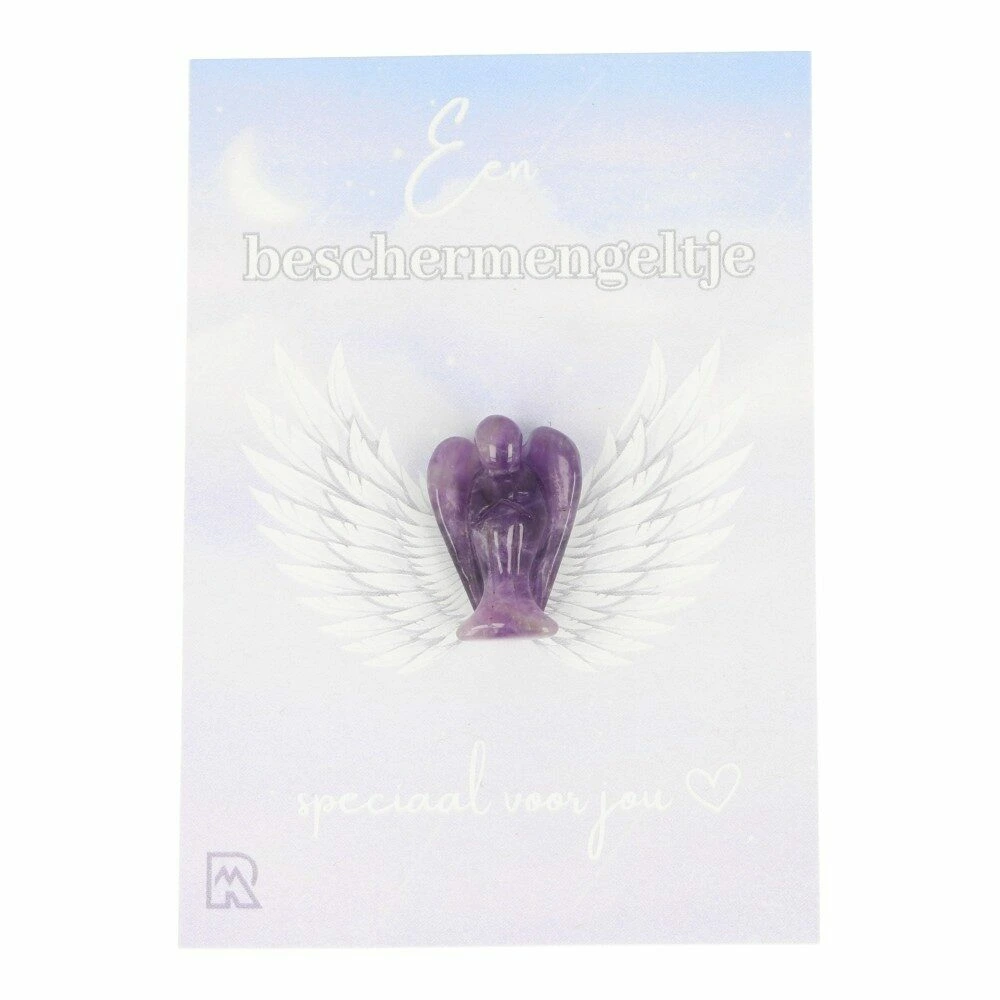 Mooie paars-witte beschermengel amethist op leuk kaartje. De afmeting van de amethist beschermengel is ongeveer 2,5cm hoog. Het kaartje met de engel zit in een doorzichtig zakje. Een leuk cadeautje voor verbinding en zuiverheid.
