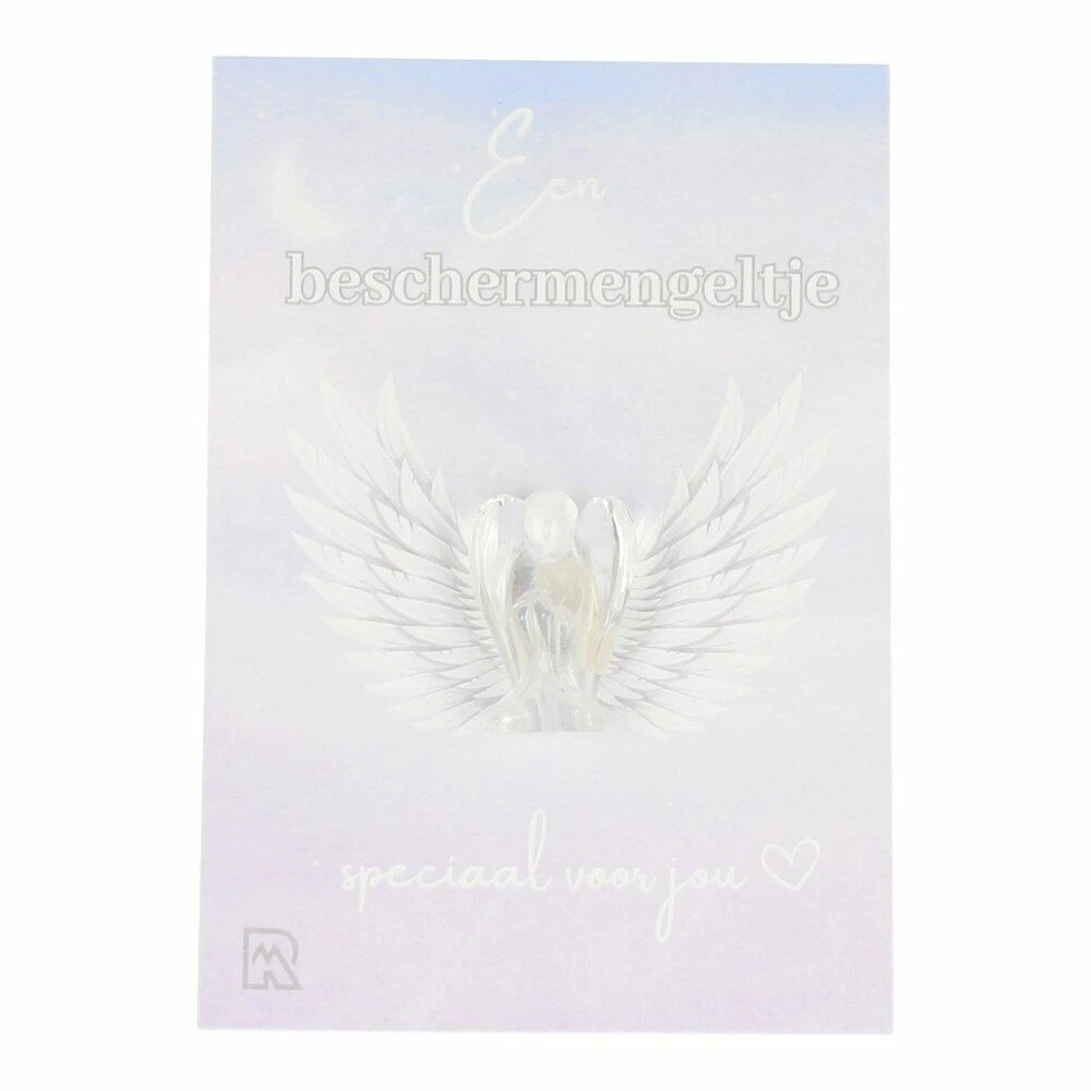 Fijn beschermengel bergkristal op leuk kaartje. De afmeting van de bergkristal beschermengel is ongeveer 2,5cm hoog. Het kaartje met de engel zit in een doorzichtig zakje. Een leuk cadeautje voor steun en helderheid.