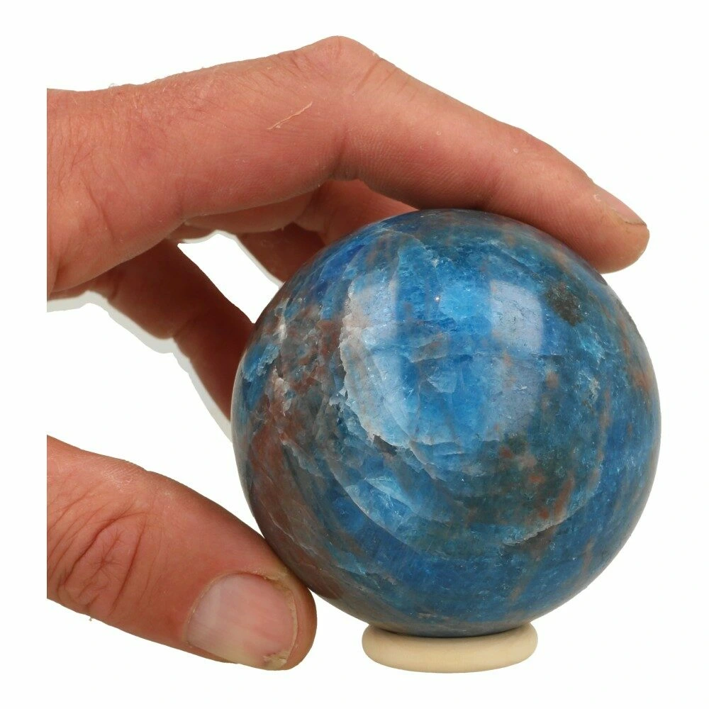 Prachtige diepblauwe apatiet bol met een diameter van 69mm op een houten ring. Deze blauwe apatiet bol is helder van kleur en heeft een fraaie schittering onder het juiste licht. Dit zie je op de foto niet, dus die bol is in het echt nog veel mooier. Je ontvangt de blauwe apatiet bol van de foto, inclusief houten ring.