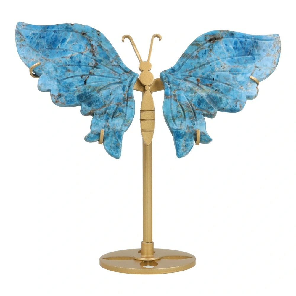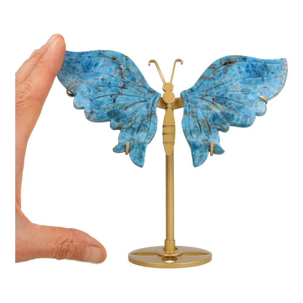 Prachtige blauwe apatiet vlinder op goudkleurige metalen standaard nr. 1. De vleugels van deze blauwe apatiet vlinder zijn mooi helderblauw met een fraai patroon. De afmetingen van deze blauwe apatiet vlinder op standaard zijn ongeveer 16cm breed en 14,5cm hoog. Uniek exemplaar met fraaie vleugels, je ontvangt uiteraard de blauwe apatiet vlinder van de foto.