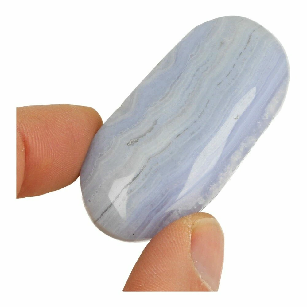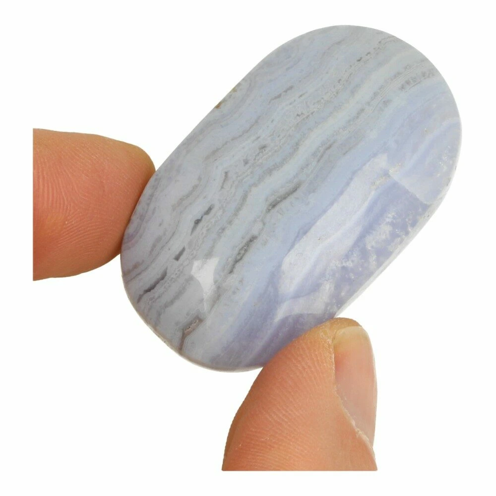Mooie blauwe chalcedoon knuffelsteen met fraaie, duidelijke agaatbanden. In het Engels heet blauwe chalcedoon ‘blue lace agate’. De afmeting van deze blauwe chalcedoon knuffelsteen is circa 5-5,5cm lang, 2,2-3cm breed en 1,5-2cm hoog. Je ontvangt een soortgelijke blauwe chalcedoon knuffelsteen als op de foto. Door de platte zijkant zijn deze blauwe chalcedoon knuffelstenen ook zeer geschikt om een mini urn van te maken.