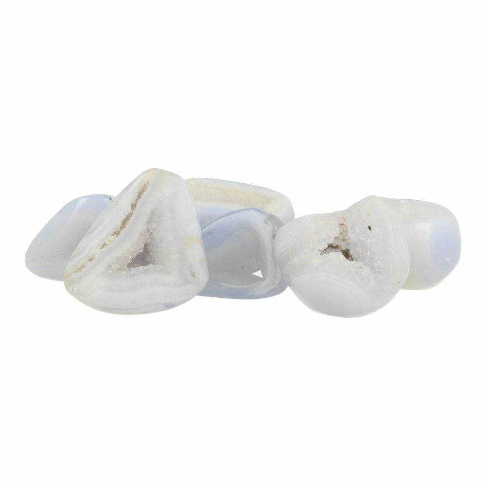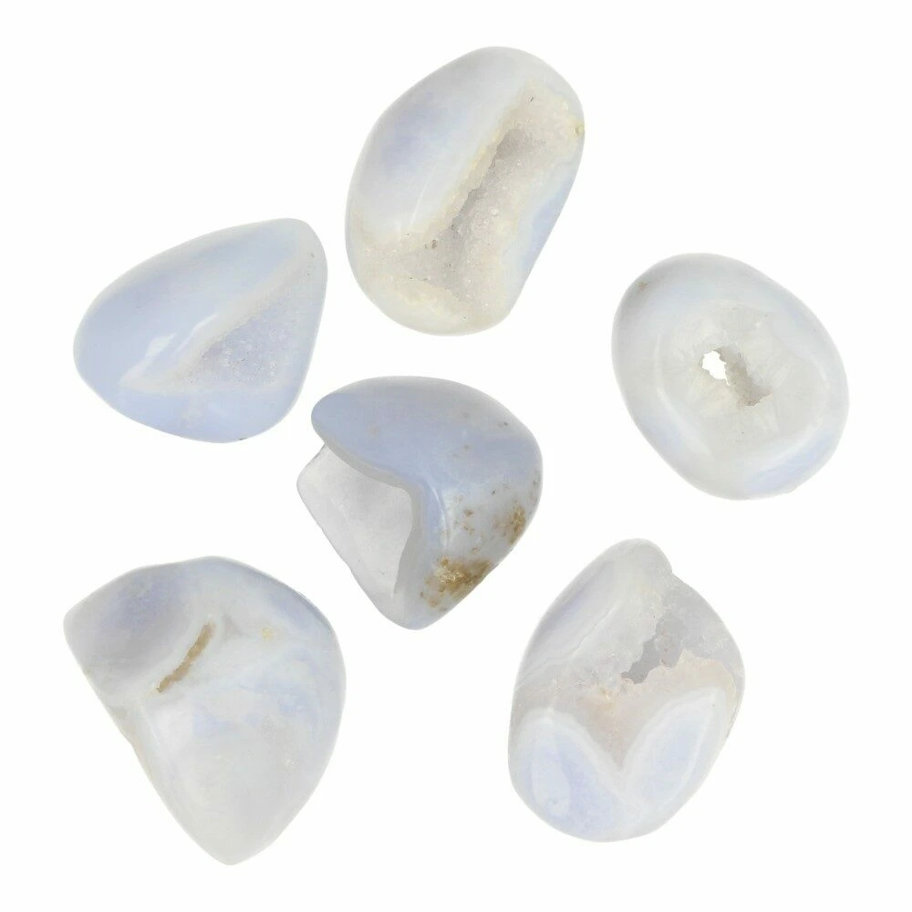 Blauwe chalcedoon trommelsteen met holte