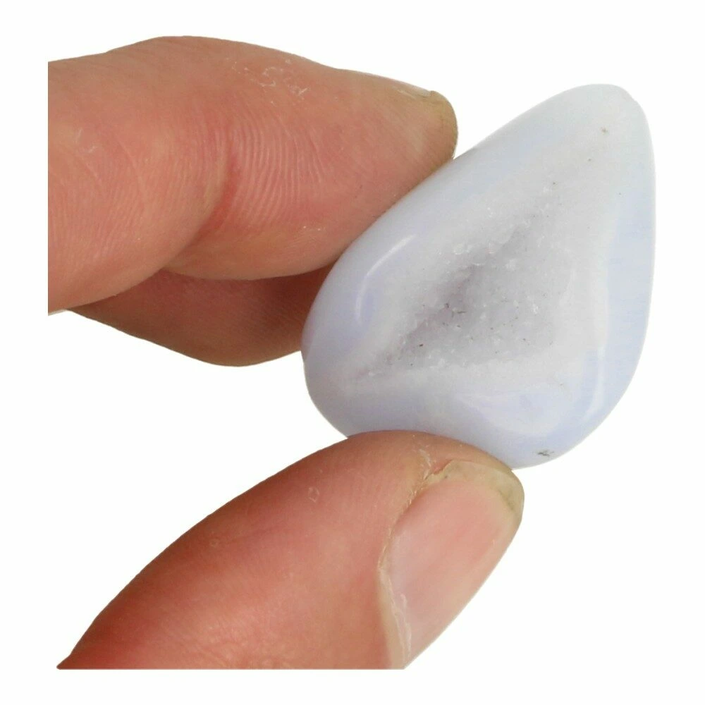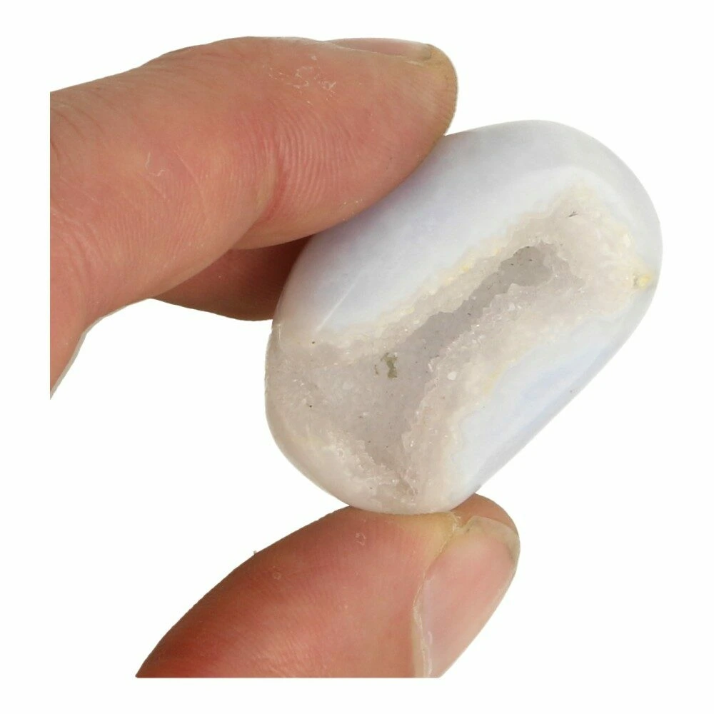 Mooie blauwe chalcedoon trommelsteen met holte en duidelijke agaat banden. In het Engels heet blauwe chalcedoon ‘blue lace agate’. De afmeting van deze blauwe chalcedoon trommelsteen met holte is circa 3,5- 4cm aan de langste zijde. Je ontvangt een soortgelijke blauwe chalcedoon trommelsteen met holte als op de foto.