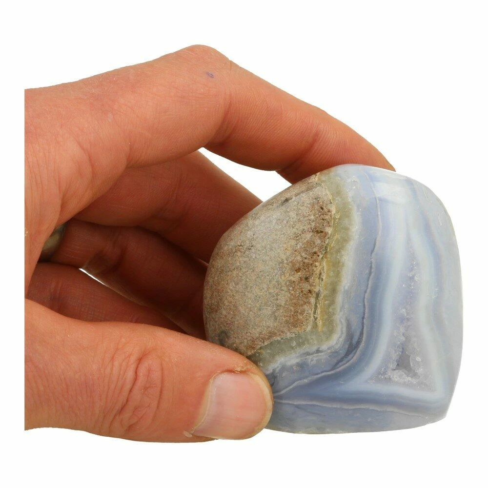 Blauwe chalcedoon is een echte steen van zachtheid. Als de stress toeneemt en je uit je basis dreigt te vallen, brengt blauwe chalcedoon kalmte en evenwicht. Het straalt serene trillingen uit waar je hele wezen baat bij heeft, van je bewuste weten tot je innerlijke kind.