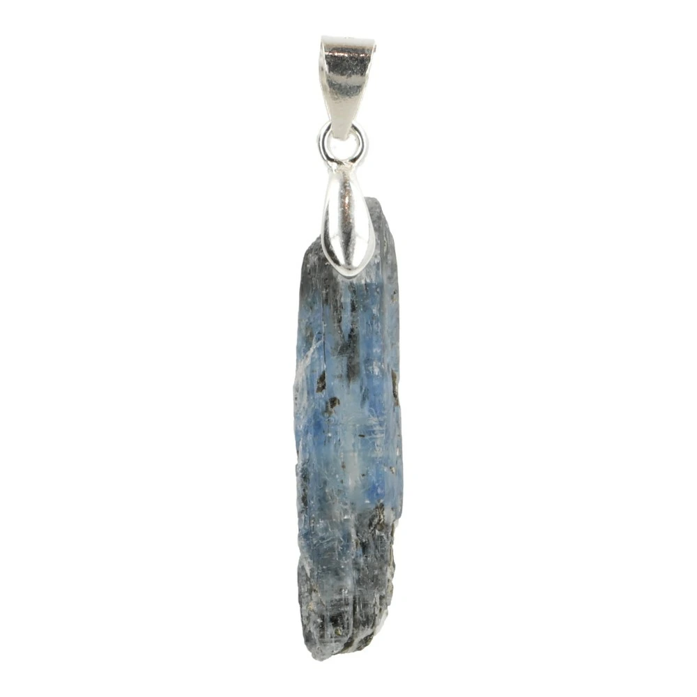 Mooie blauwe kyaniet hanger ruw met zilveren clipje uit Karoi, Zimbabwe. Deze fraaie kwaliteit kyaniet hangers hebben een mooie glans en enige transparantie, erg mooi om te zien. Unieke eigenschap is dat ze rood oplichten onder UV-lich, iets wat blauwe kyaniet normaal niet doet. Je ontvangt een soortgelijke kyaniet hanger zonder koord en kan de hanger prima dragen aan een Zilveren ketting. Iedere hanger is net anders in tekening. De afmeting van deze kyaniet hanger is ongeveer 0,5-1cm breed en 2,2-3,5 cm hoog.