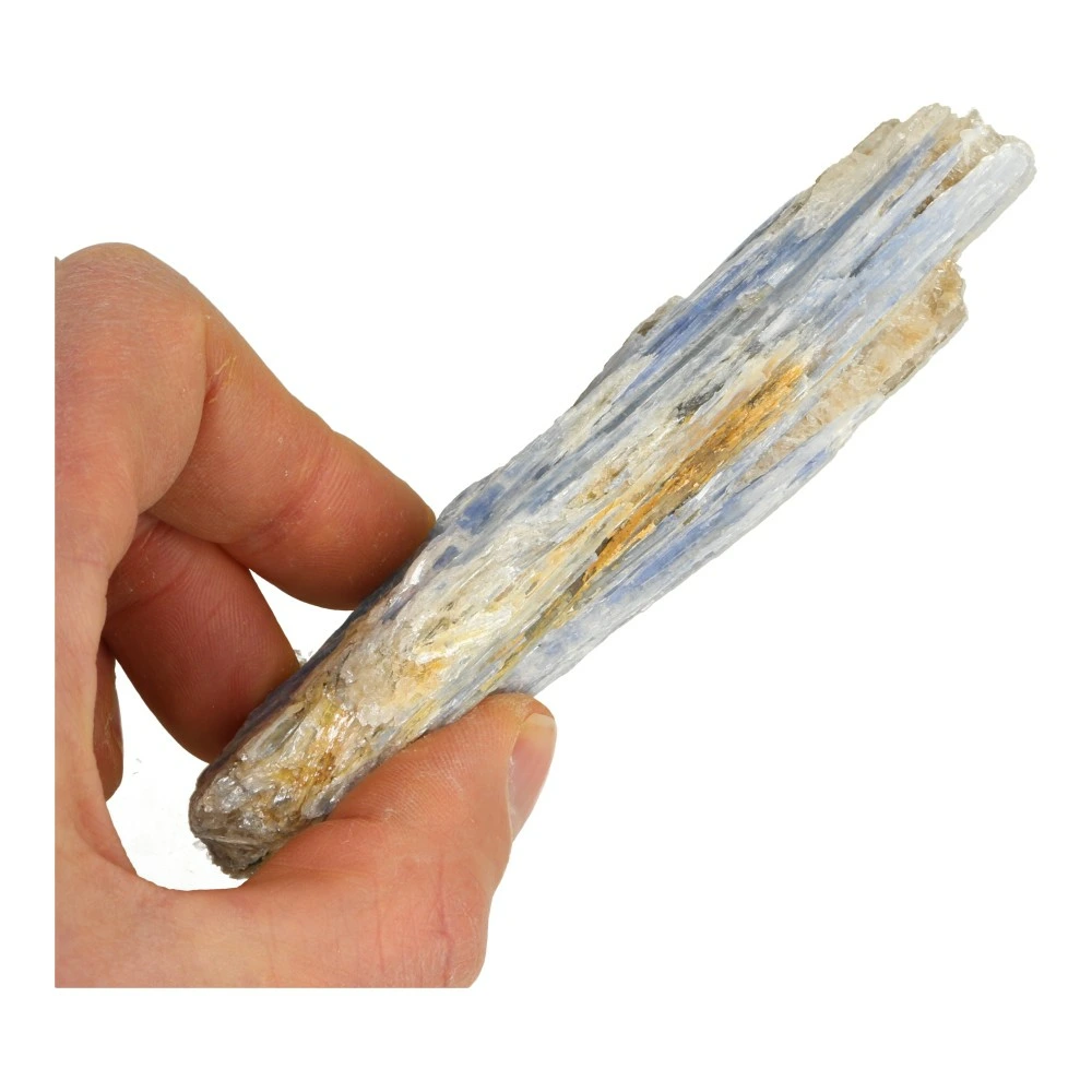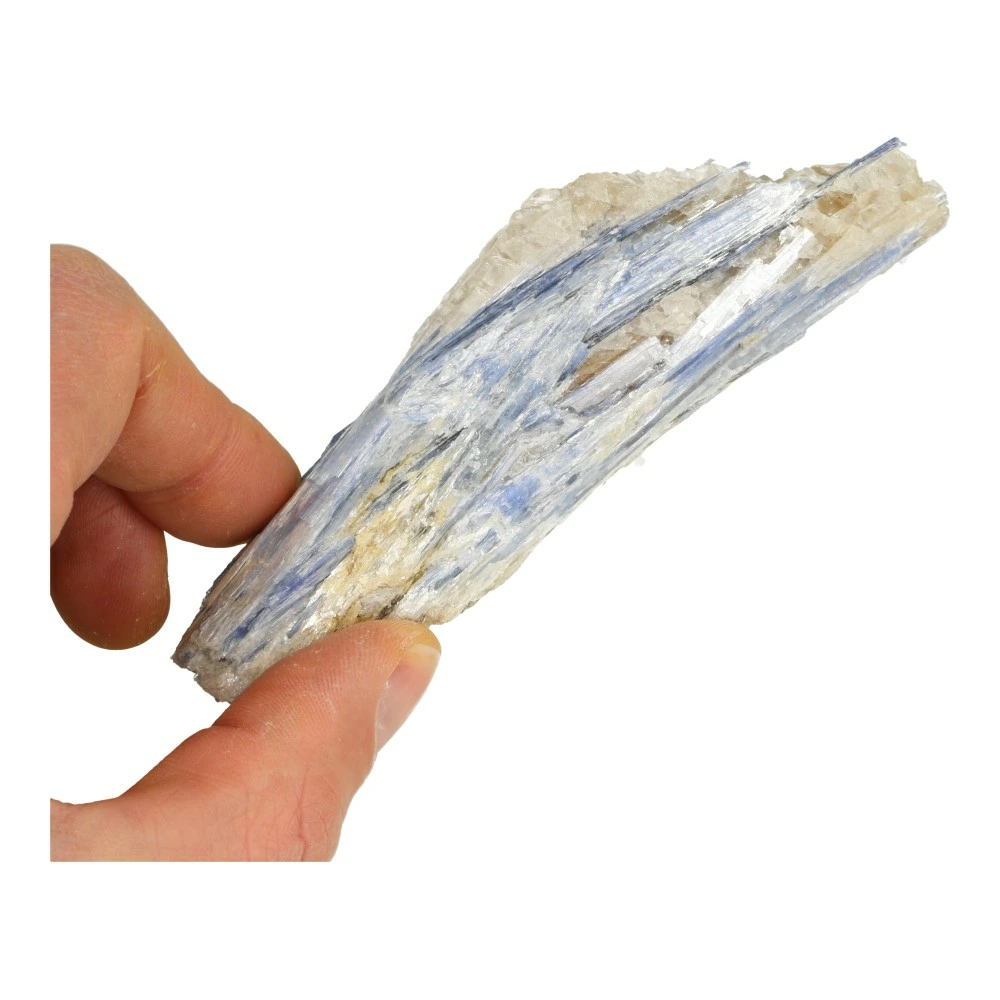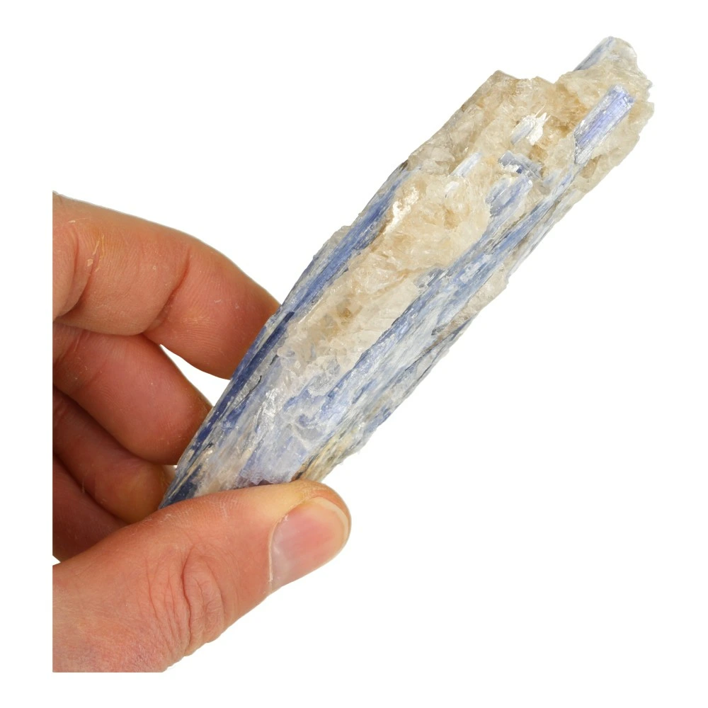 Mooie blauwe kyaniet ruw in kwarts uit Brazilië. De afmeting van dit fijne stuk kyaniet ruw zijn ongeveer 13cm lang, 3,2cm breed en 2,6cm hoog. Dit is een uniek product, je ontvangt het stuk kyaniet ruw van de foto.