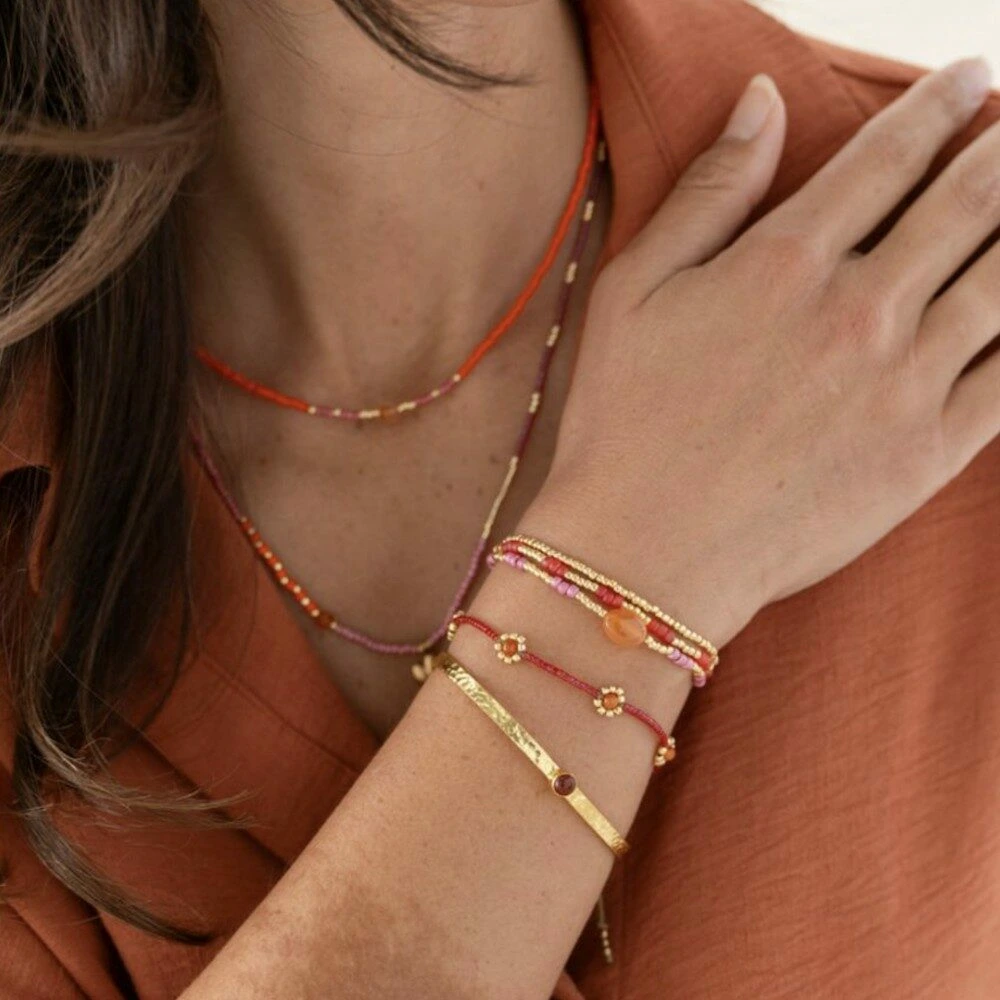 Breng een vonk van levenskracht aan je dag met de carneool armband Energetic. Deze met de hand geregen armband combineert warme oranje carneool met subtiel glinsterende glas- en messingkralen, waardoor een sierlijk en energiek geheel ontstaat. Het goudkleurige accent geeft de armband een elegante, almost zonnige uitstraling — precies wat je van carneool mag verwachten. Deze armband is uit één stuk gemaakt en kan drie maal rond je pols worden geslagen.