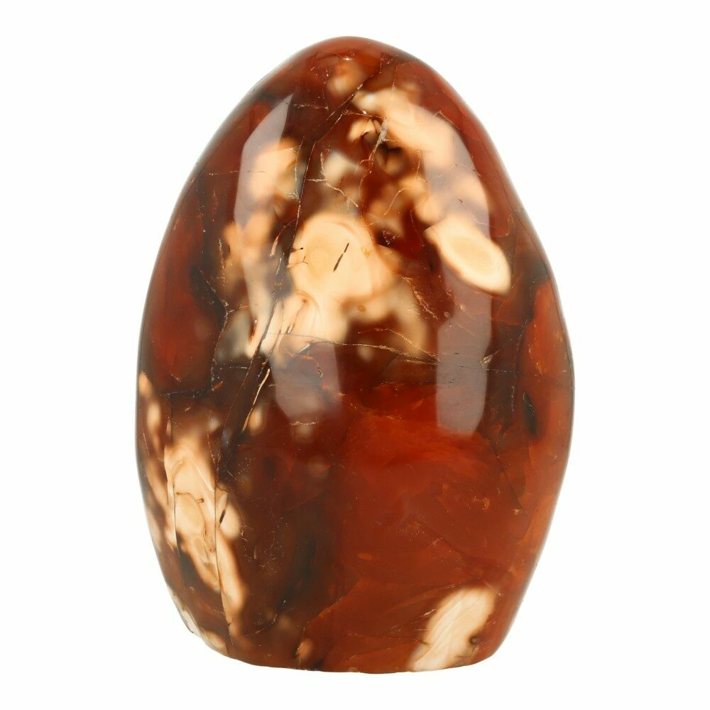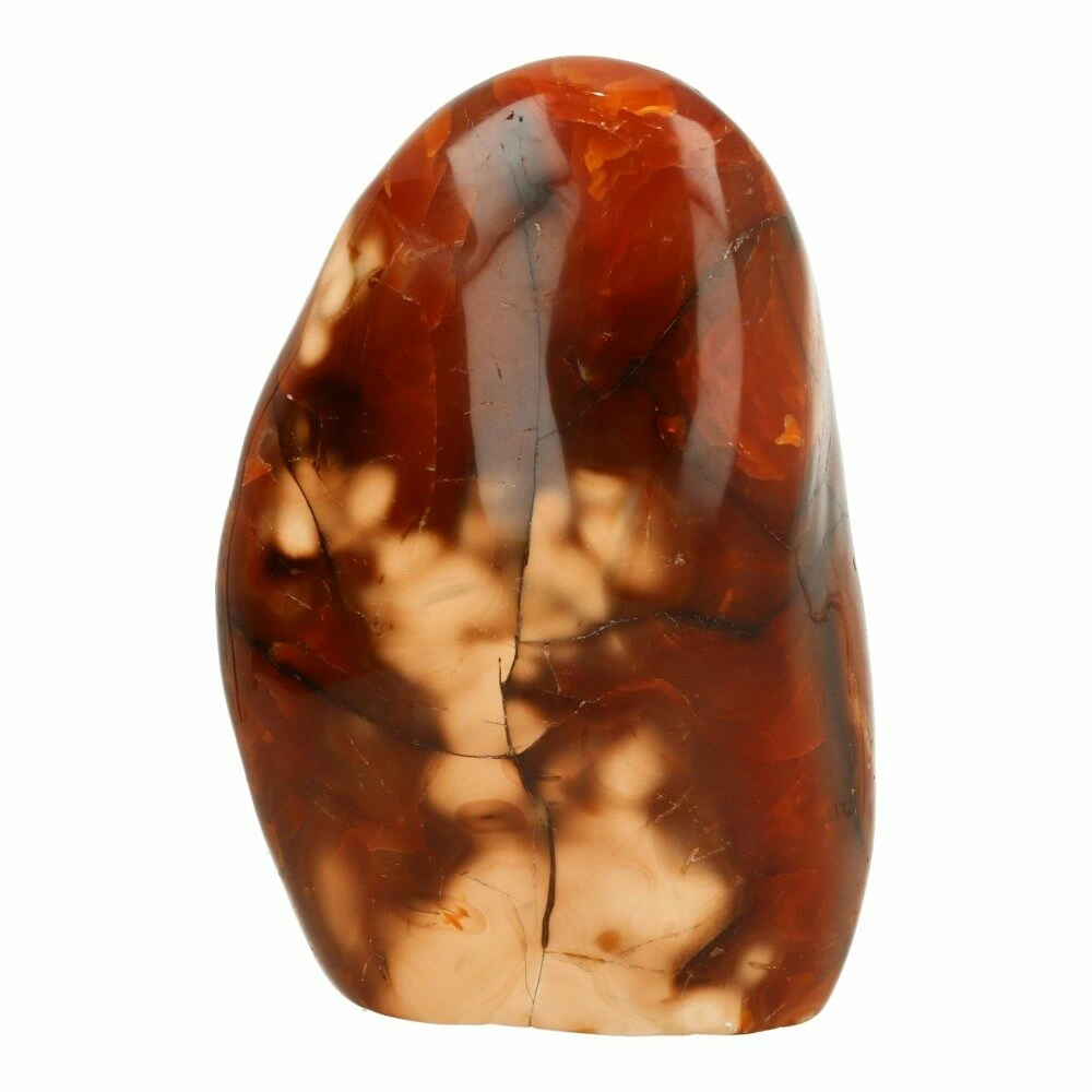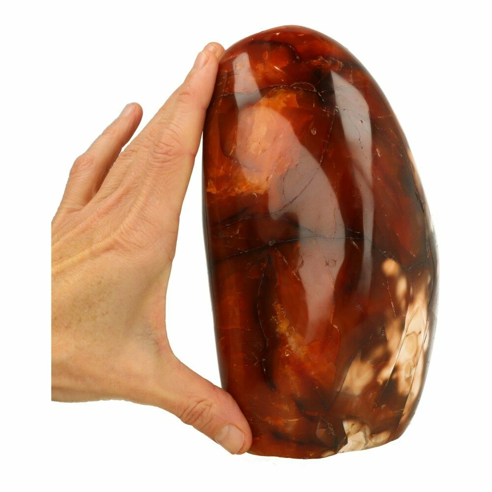 Fijne donkerrode carneool gepolijste vorm XL van circa 19cm hoog, 14cm breed en 11cm dik met een gewicht van 4,4kg. Een fraaie, stevige carneool die je uitnodigt stevig in je schoenen te staan en vanuit jouw centrum de wereld in te gaan. In zachtheid, speelsheid en vol zelfvertrouwen. Je ontvangt de carneool vrije vorm XL van de foto.