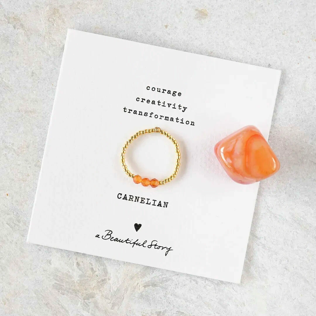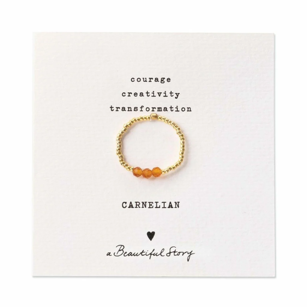 Ontdek de Clarity Carneool Goudkleurige Ring. Deze ring heeft 3 carneool edelstenen en goudkleurige kralen. Perfect om te combineren met je andere favorieten of om op zichzelf te laten stralen. A Beautiful Story edelsteen sieraden geven betekenis en begeleiden je op je pad. De kralen van de ring zijn geregen op rekbaar koord.
