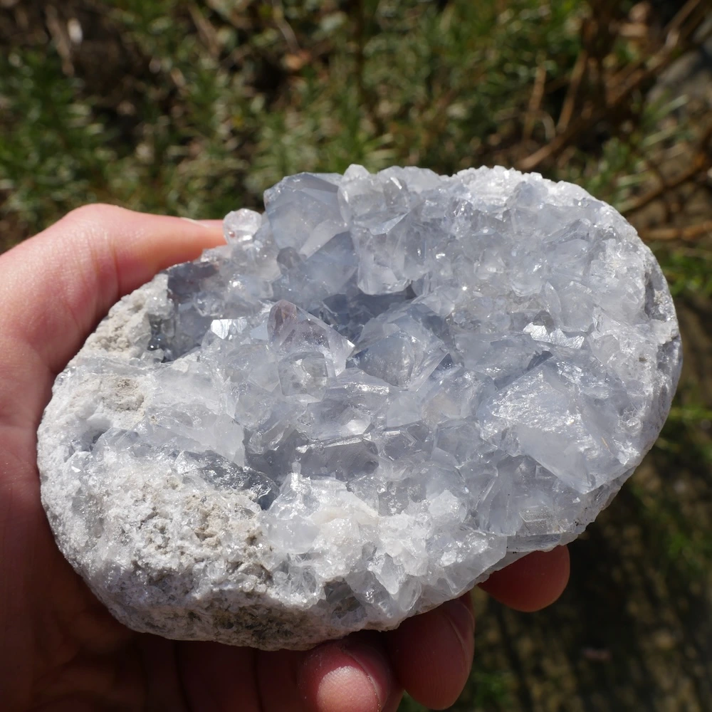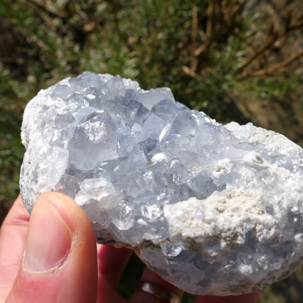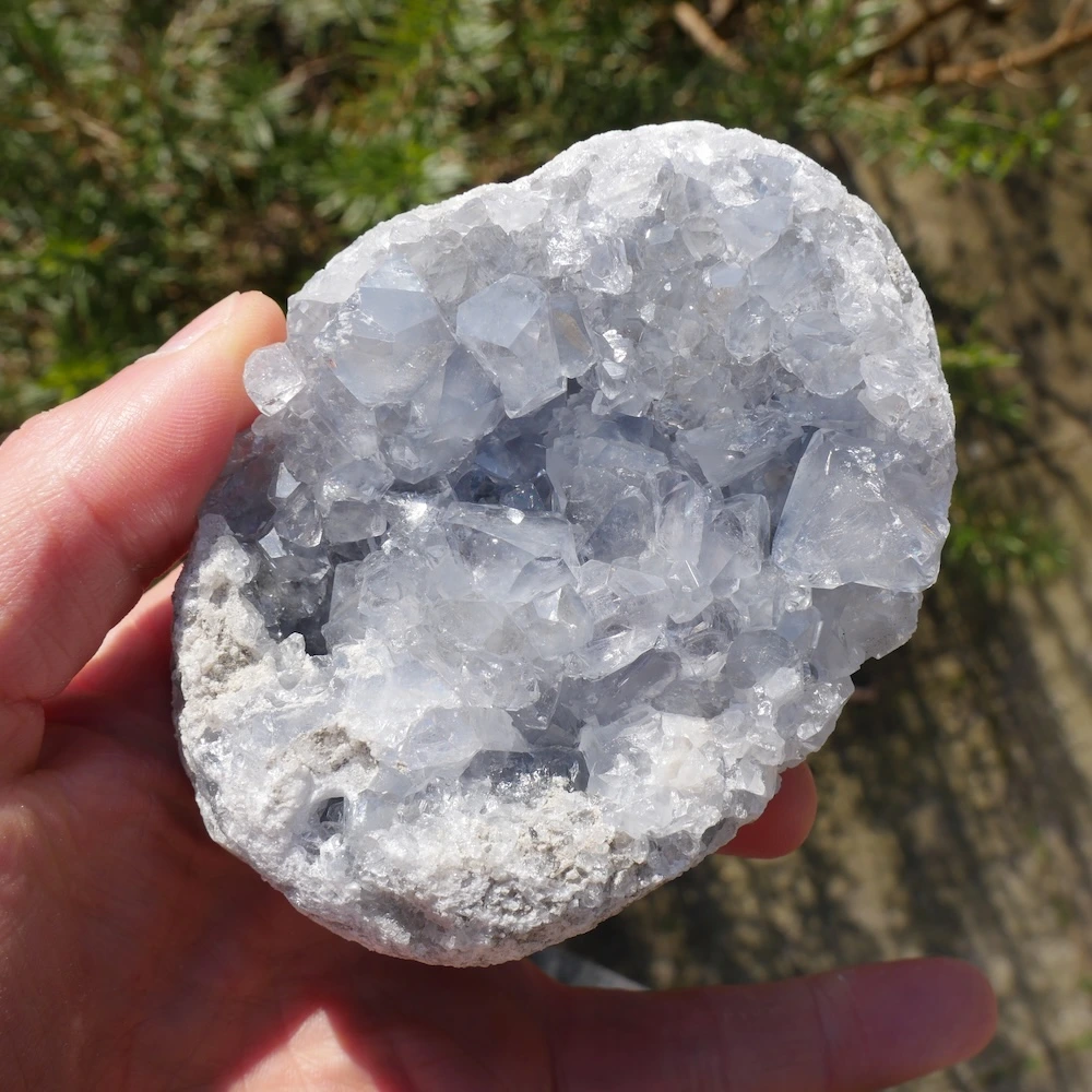 Fraai helder celestien cluster met fijne energie en heldere kristallen. Dit fraaie stuk met mooie vorm en energie is circa 11,8 x 8,9cm en 5,5cm hoog. Zoek je een ander stuk? Neem contact met ons op, want we hebben een steeds wisselende voorraad mooie celestien clusters!