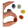 Fijne set van 7 ovale, platte zakstenen behorende bij de 7 chakra’s. Voor iedere chakra een aparte kleur. De stenen hebben een afmeting van circa 2,5 x 2cm en 8mm dik. Je ontvangt een soortgelijke set als op de foto in een linnen zakje.