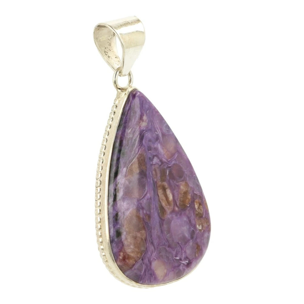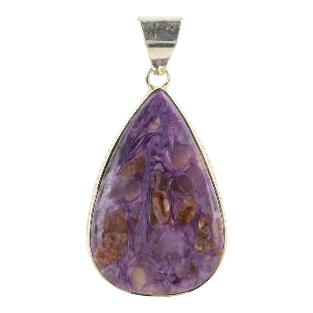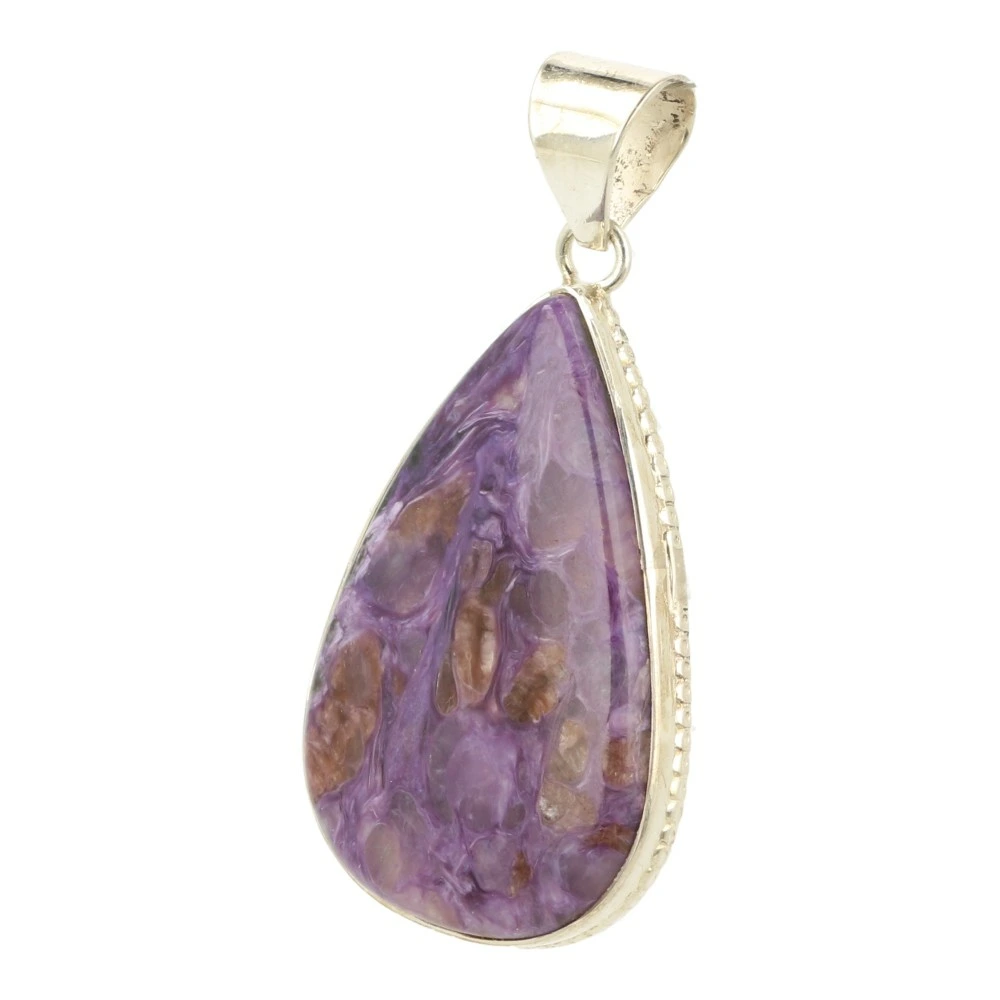Prachtig gemêleerd paarse charoiet hanger, gevat in juwelierskwaliteit 925 sterling zilver. De afmeting van de charoiet steen in deze hanger is ongeveer 38mm hoog en 24mm breed en met sierlijk zilverwerk. Je ontvangt de hanger van de foto.