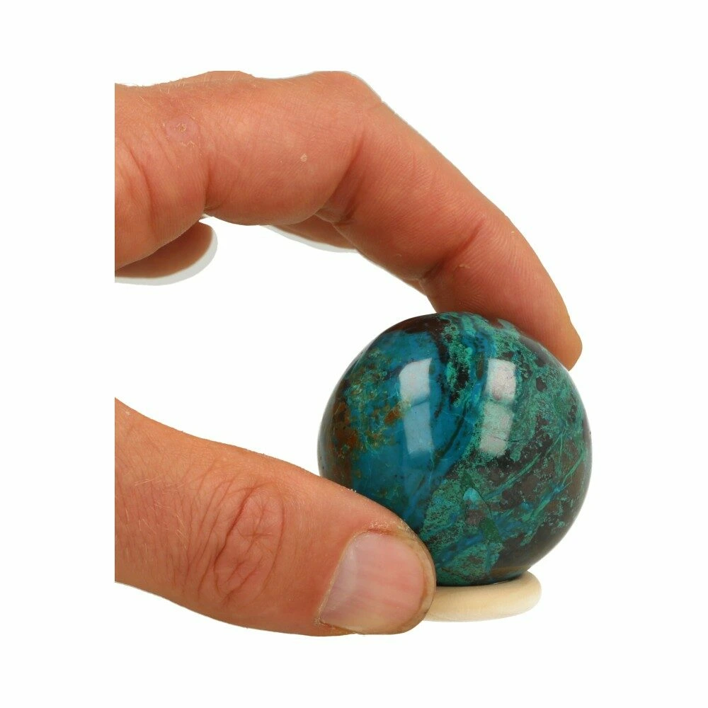 Deze A-kwaliteit chrysocolla bol heeft een diameter van ongeveer 46mm diameter en is een echte beauty. Unieke kwaliteit en tekening! Je ontvangt de chrysocolla bol van de foto, inclusief houten ring. Fijne bol met heldere energie.