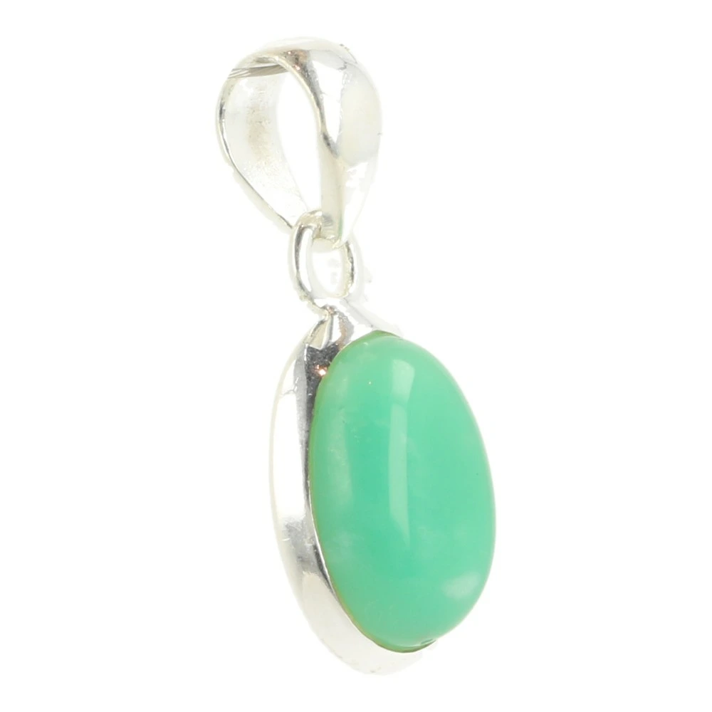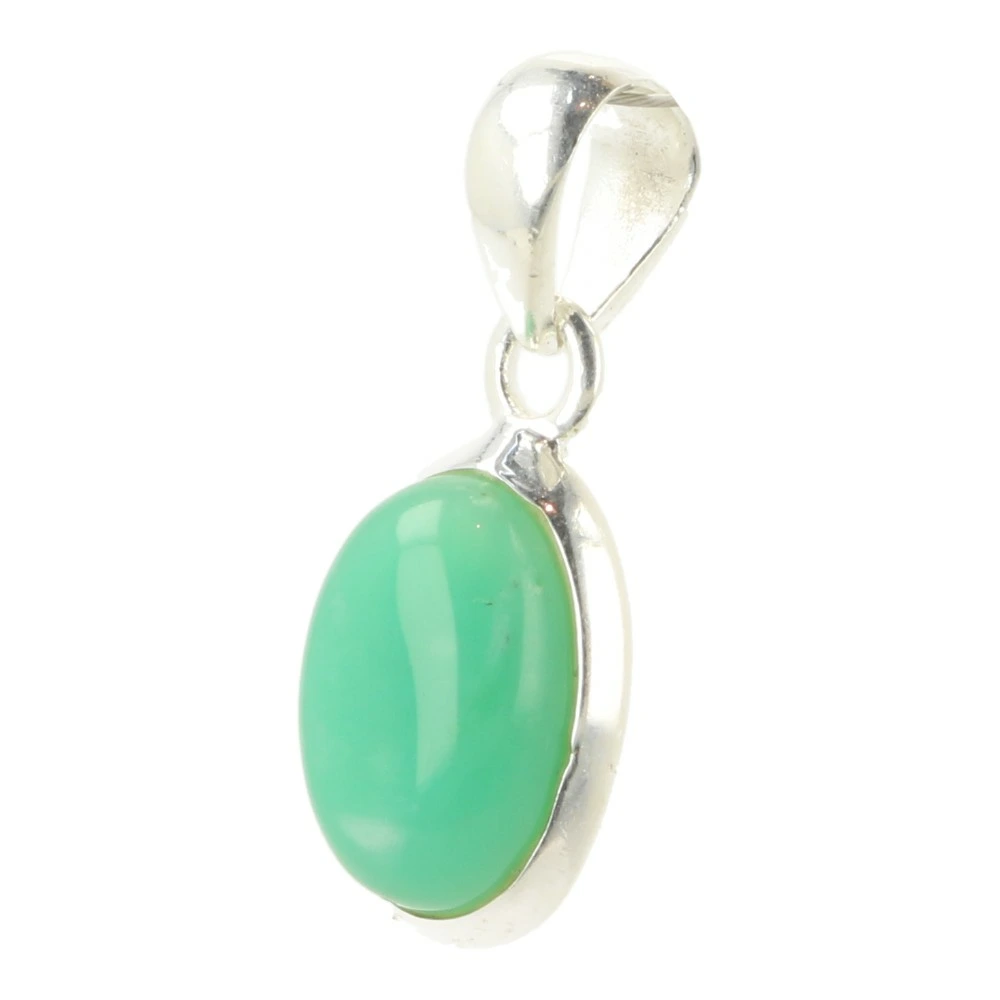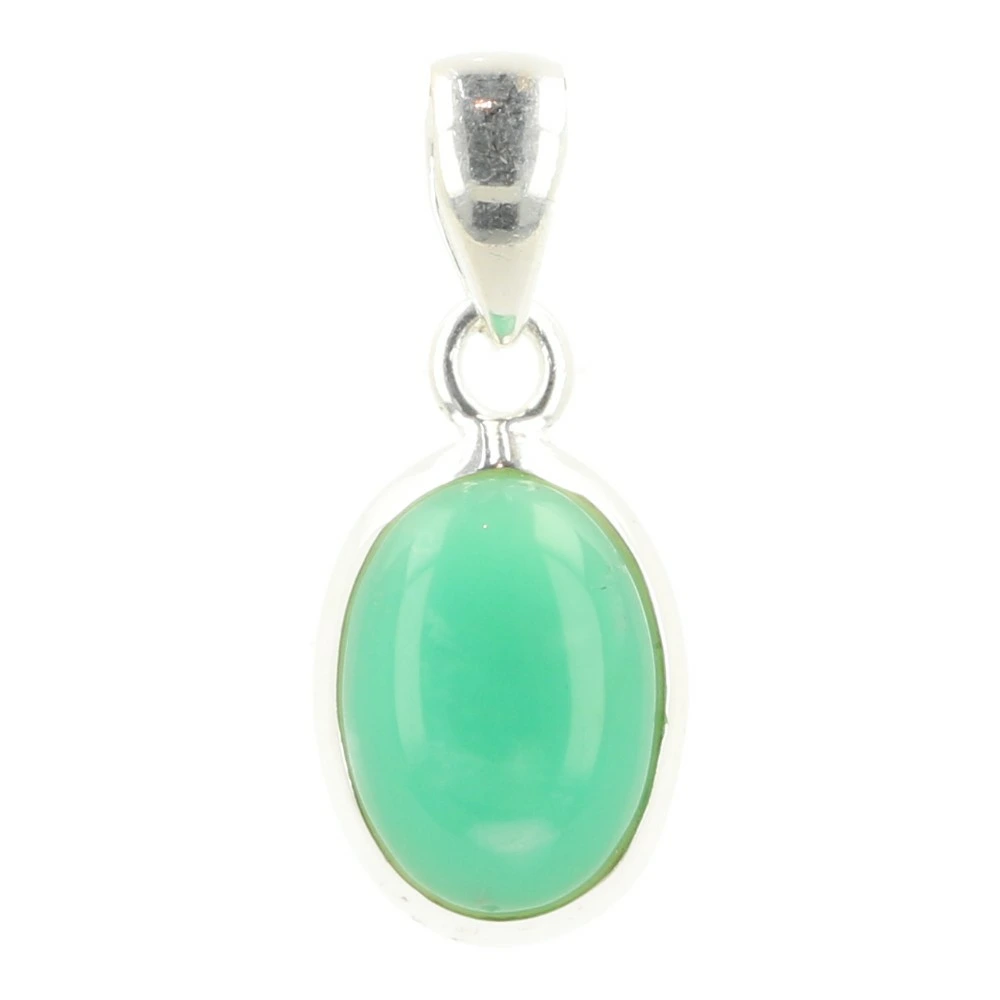Mooie groene chrysopraas hanger in juwelierskwaliteit zilver (925 sterling) in ovale vorm met bewerkte zilverrand. De afmeting van de chrysopraas is ongeveer 14mm hoog en 10mm breed. Je ontvangt deze fraaie chrysopraas hanger van de foto.