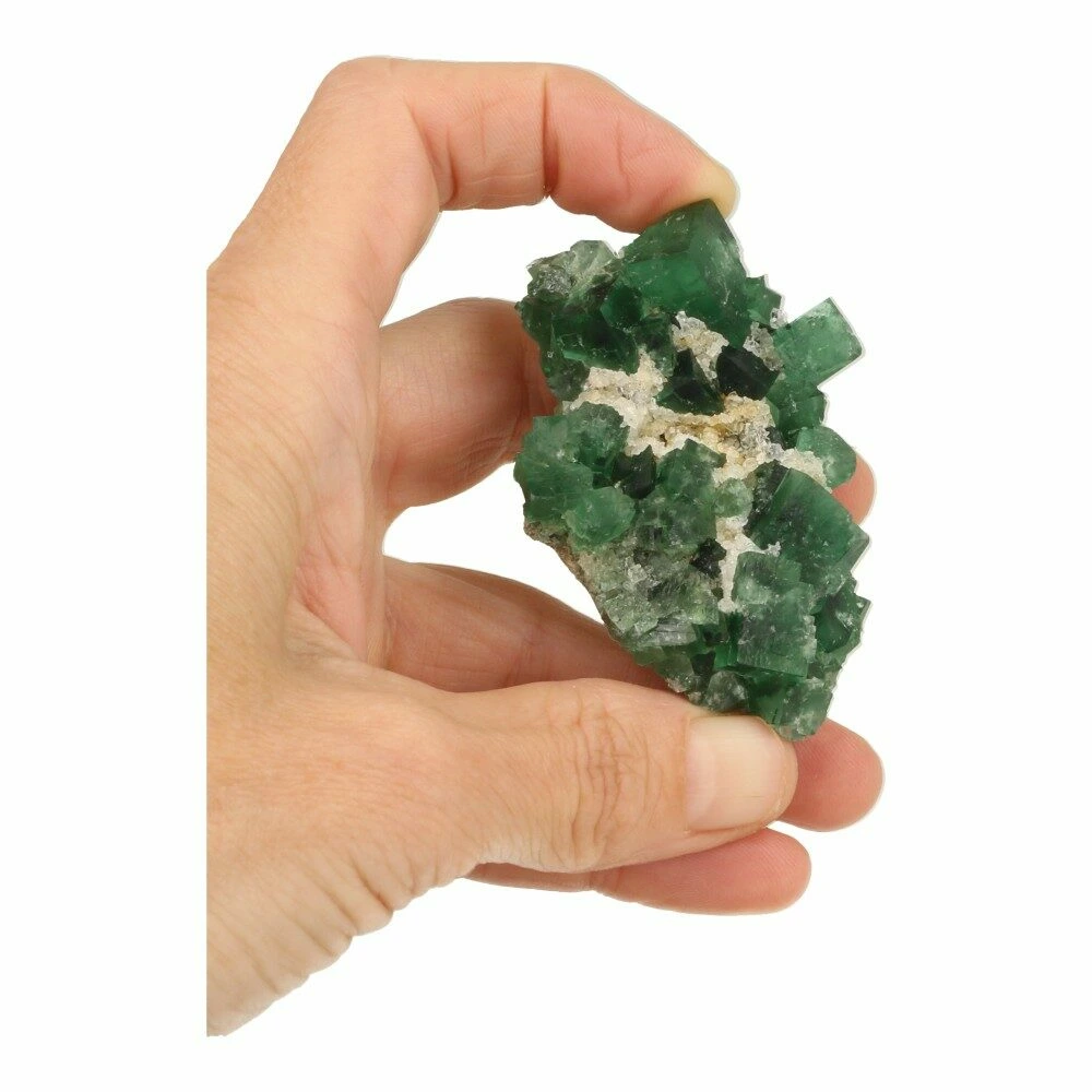 Prachtige groene ruwe fluoriet kristallen op matrix uit Engeland. Naast de uitzonderlijke kwaliteit van de fluorietkristallen zijn deze daglucht actief. Dat betekent dat ze onder invloed van daglicht een blauwe gloed krijgen. En op UV-licht reageren ze helemaal spectaculair. Deze fluoriet komt uit de Druzy Dreams Pocket van de Rogerly Mine in Frosterley, Weardale. De afmeting van dit fraaie stuk is ongeveer 65 x 42mm en 23mm hoog. Over de fluoriet kristallen zijn gedeeltelijk kwartskristallen gevormd, kenmerkend voor deze pocket. Bijzonder en zeldzaam materiaal, direct van de mijn in Engeland. Je ontvangt het ruwe daglichtfluoriet cluster van de foto.