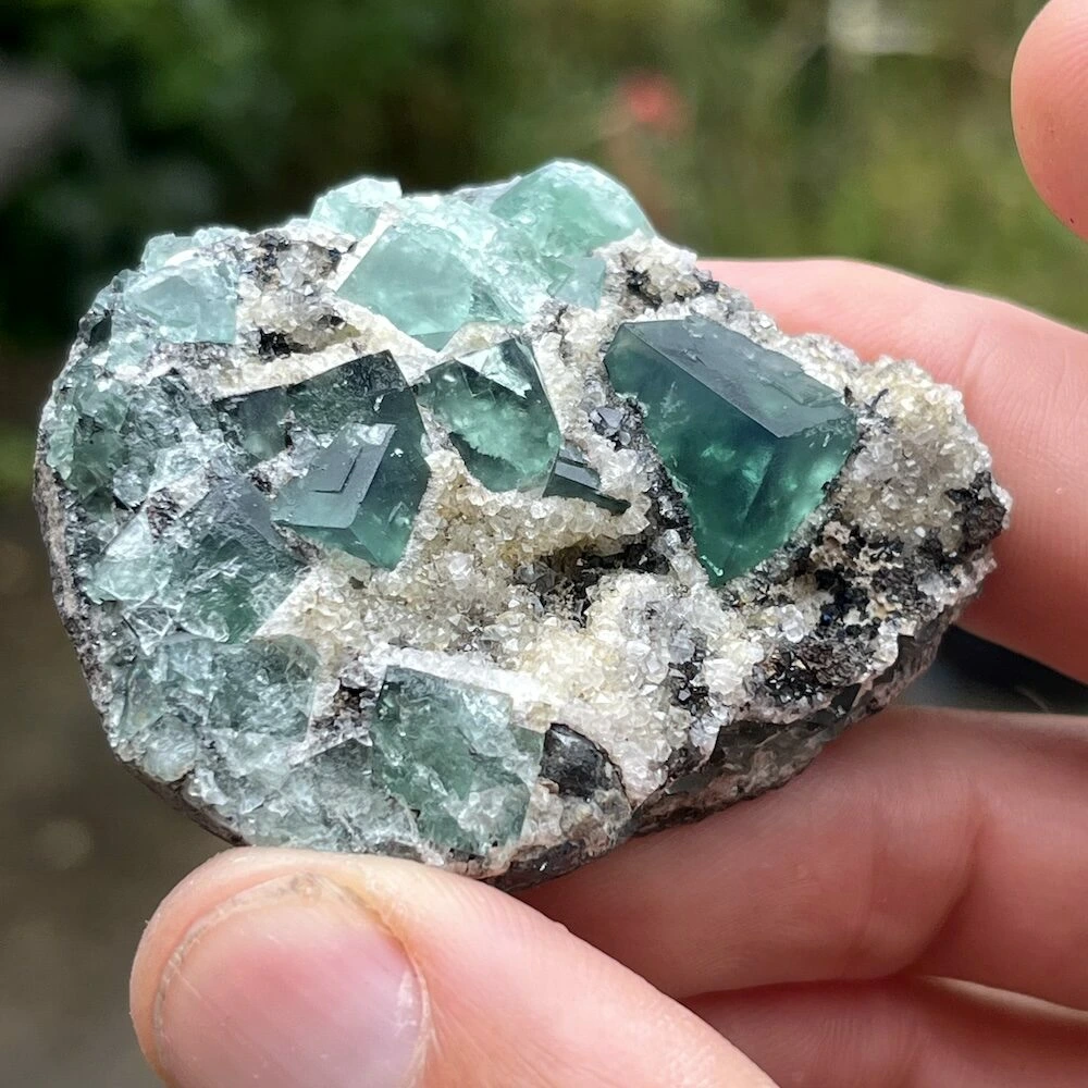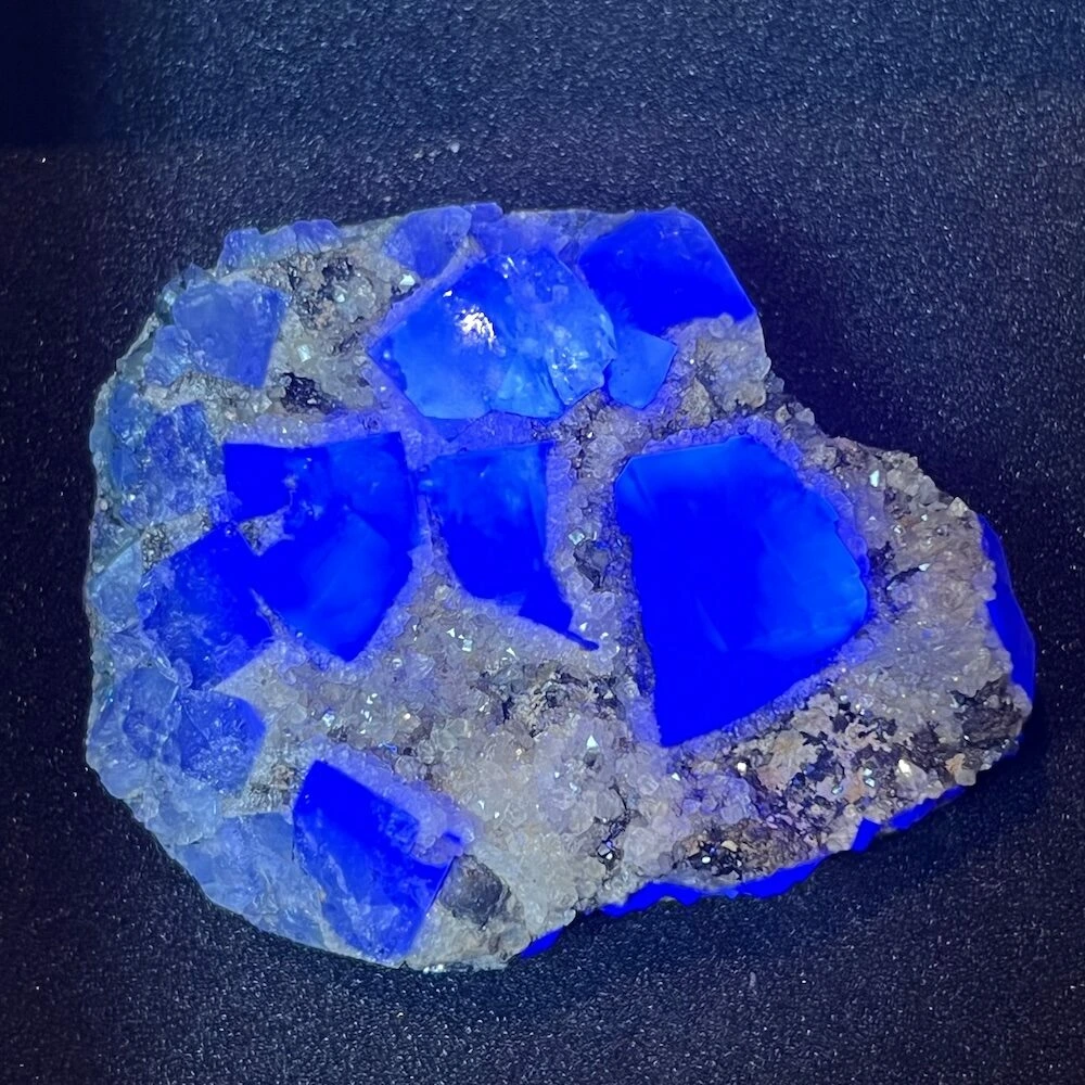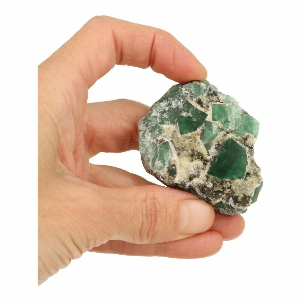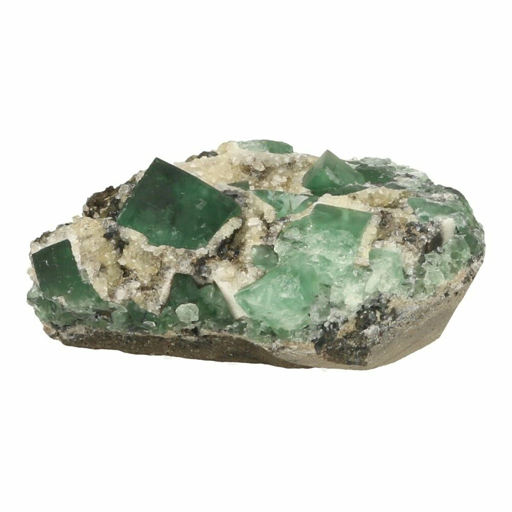 Prachtige groene ruwe fluoriet kristallen op matrix uit Engeland. Naast de uitzonderlijke kwaliteit van de fluorietkristallen zijn deze daglicht actief. Dat betekent dat ze onder invloed van daglicht een blauwe gloed krijgen. En op UV-licht reageren ze helemaal spectaculair. Deze fluoriet komt uit de Druzy Dreams Pocket van de Rogerly Mine in Frosterley, Weardale. De afmeting van dit fraaie stuk is ongeveer 67 x 50mm en 29mm hoog. Over de fluoriet kristallen zijn gedeeltelijk kwartskristallen en galeniet gevormd, kenmerkend voor deze pocket. Bijzonder en zeldzaam materiaal, direct van de mijn in Engeland. Je ontvangt het ruwe daglichtfluoriet cluster van de foto.