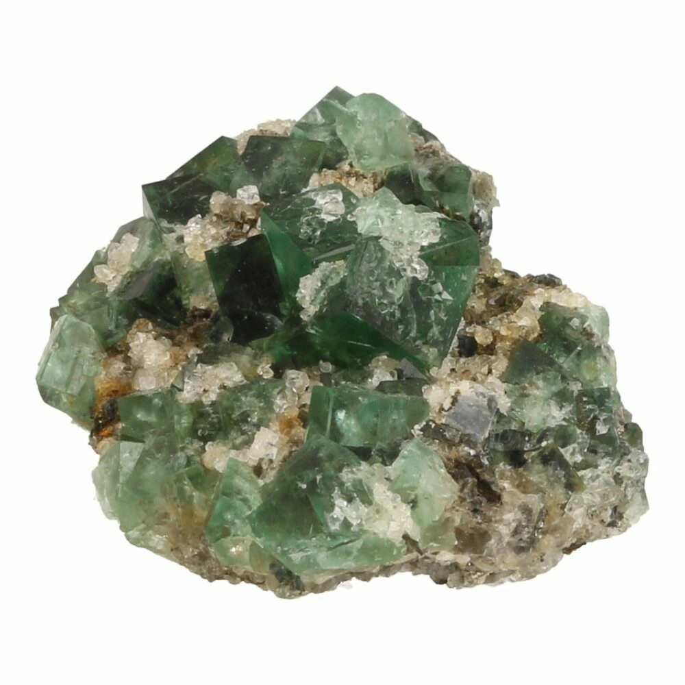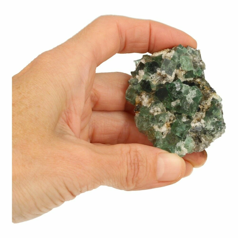 Prachtige groene ruwe fluoriet kristallen op matrix uit Engeland. Naast de uitzonderlijke kwaliteit van de fluorietkristallen zijn deze daglicht actief. Dat betekent dat ze onder invloed van daglicht een blauwe gloed krijgen. En op UV-licht reageren ze helemaal spectaculair. Deze fluoriet komt uit de Druzy Dreams Pocket van de Rogerly Mine in Frosterley, Weardale. De afmeting van dit fraaie stuk is ongeveer 59 x 43mm en 28mm hoog. Over de fluoriet kristallen zijn gedeeltelijk kwartskristallen gevormd, kenmerkend voor deze pocket. Bijzonder en zeldzaam materiaal, direct van de mijn in Engeland. Je ontvangt het ruwe daglichtfluoriet cluster van de foto.