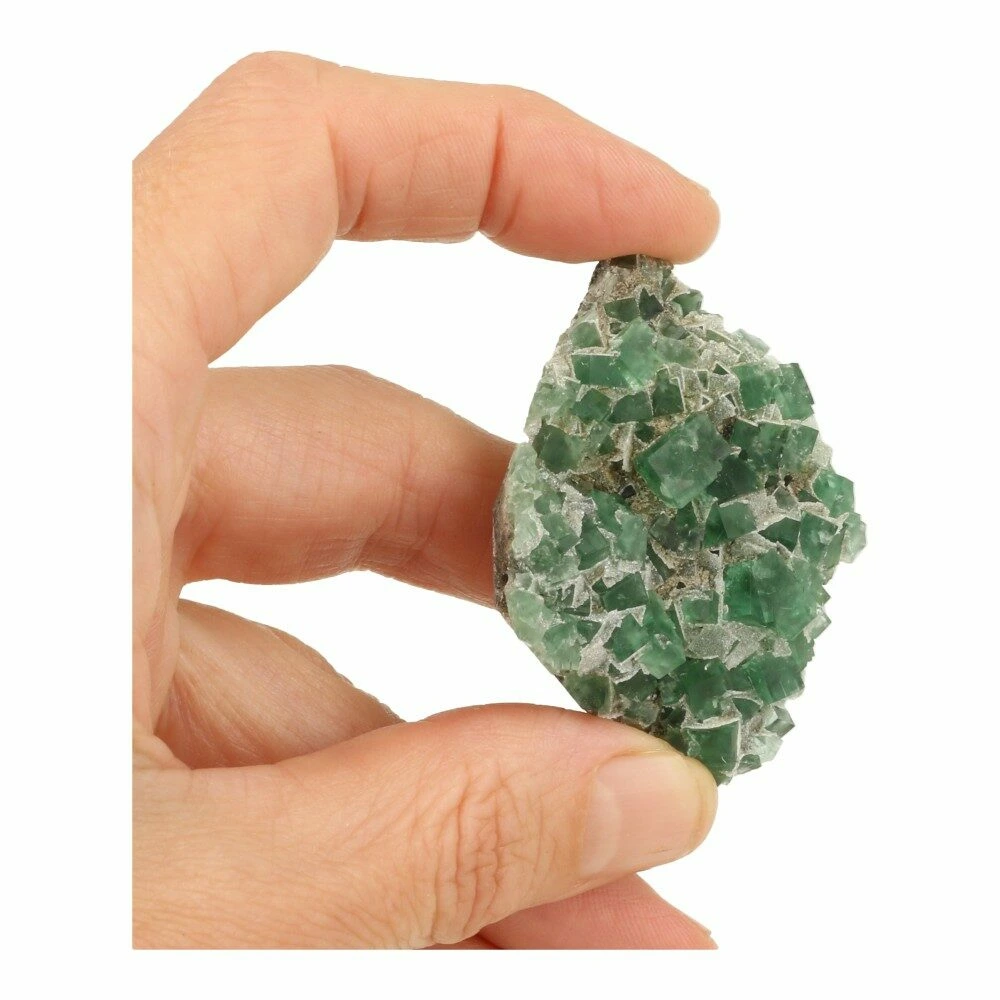 Prachtige groene ruwe fluoriet kristallen op matrix uit Engeland. Naast de uitzonderlijke kwaliteit van de fluorietkristallen zijn deze daglicht actief. Dat betekent dat ze onder invloed van daglicht een blauwe gloed krijgen. En op UV-licht reageren ze helemaal spectaculair. Deze fluoriet komt uit de Druzy Dreams Pocket van de Rogerly Mine in Frosterley, Weardale. De afmeting van dit fraaie stuk is ongeveer 57 x 43mm en 17mm hoog. Over de fluoriet kristallen zijn gedeeltelijk kwartskristallen gevormd, kenmerkend voor deze pocket. Bijzonder en zeldzaam materiaal, direct van de mijn in Engeland. Je ontvangt het ruwe daglichtfluoriet cluster van de foto.