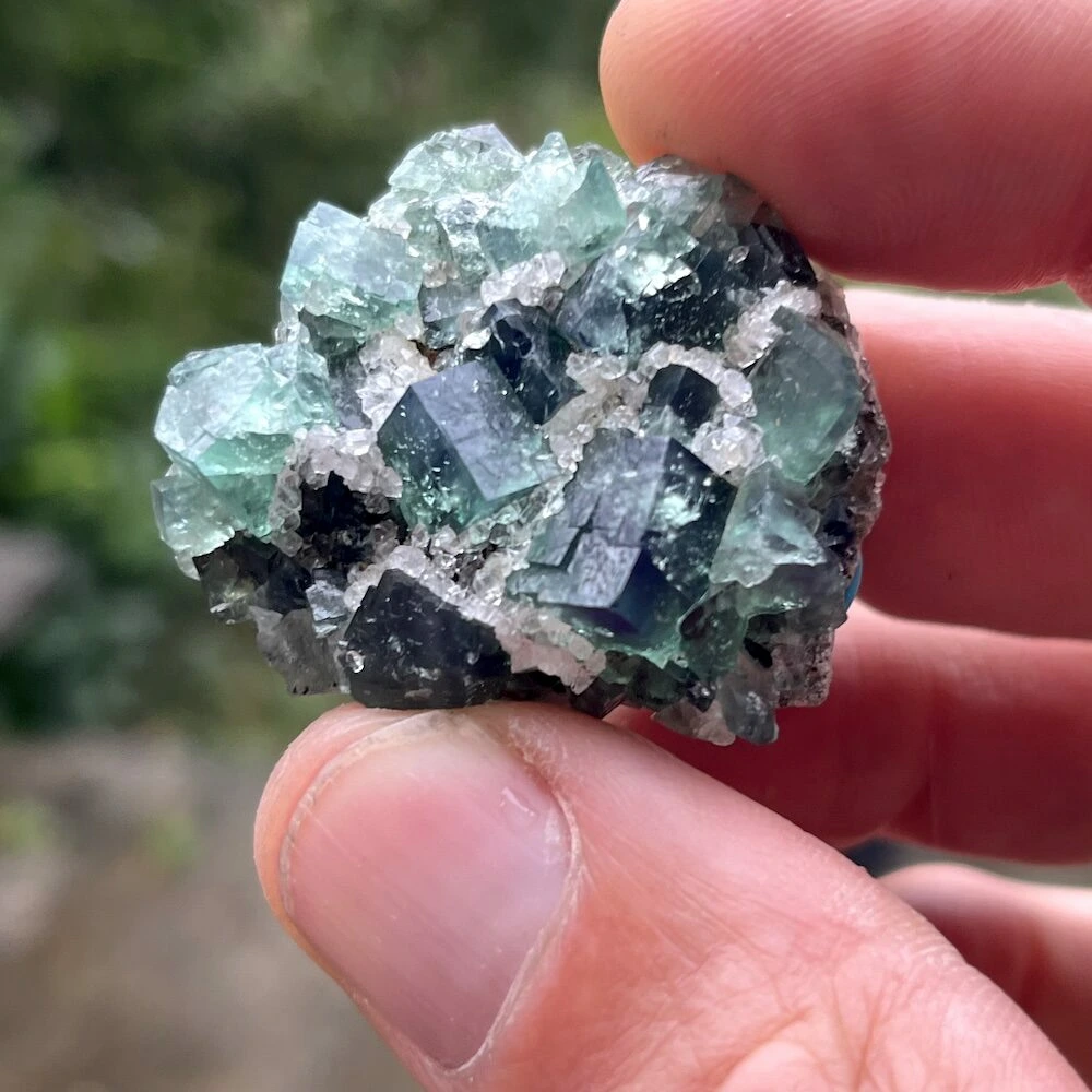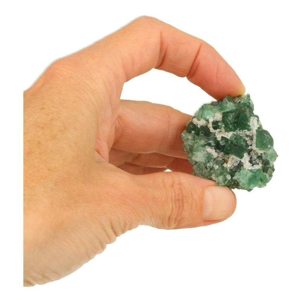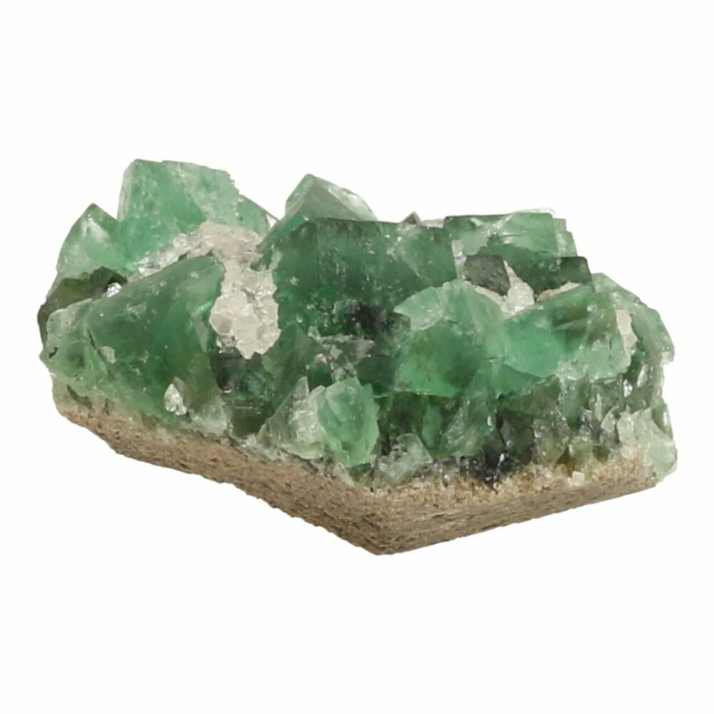 Prachtige groene ruwe fluoriet kristallen op matrix uit Engeland. Naast de uitzonderlijke kwaliteit van de fluorietkristallen zijn deze daglicht actief. Dat betekent dat ze onder invloed van daglicht een blauwe gloed krijgen. En op UV-licht reageren ze helemaal spectaculair. Deze fluoriet komt uit de Druzy Dreams Pocket van de Rogerly Mine in Frosterley, Weardale. De afmeting van dit fraaie stuk is ongeveer 57 x 43mm en 17mm hoog. Over de fluoriet kristallen zijn gedeeltelijk kwartskristallen gevormd, kenmerkend voor deze pocket. Bijzonder en zeldzaam materiaal, direct van de mijn in Engeland. Je ontvangt het ruwe daglichtfluoriet cluster van de foto.