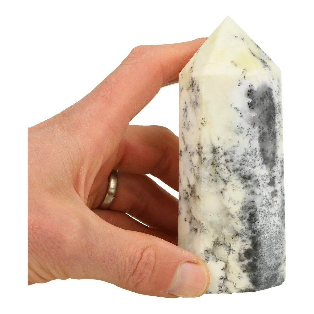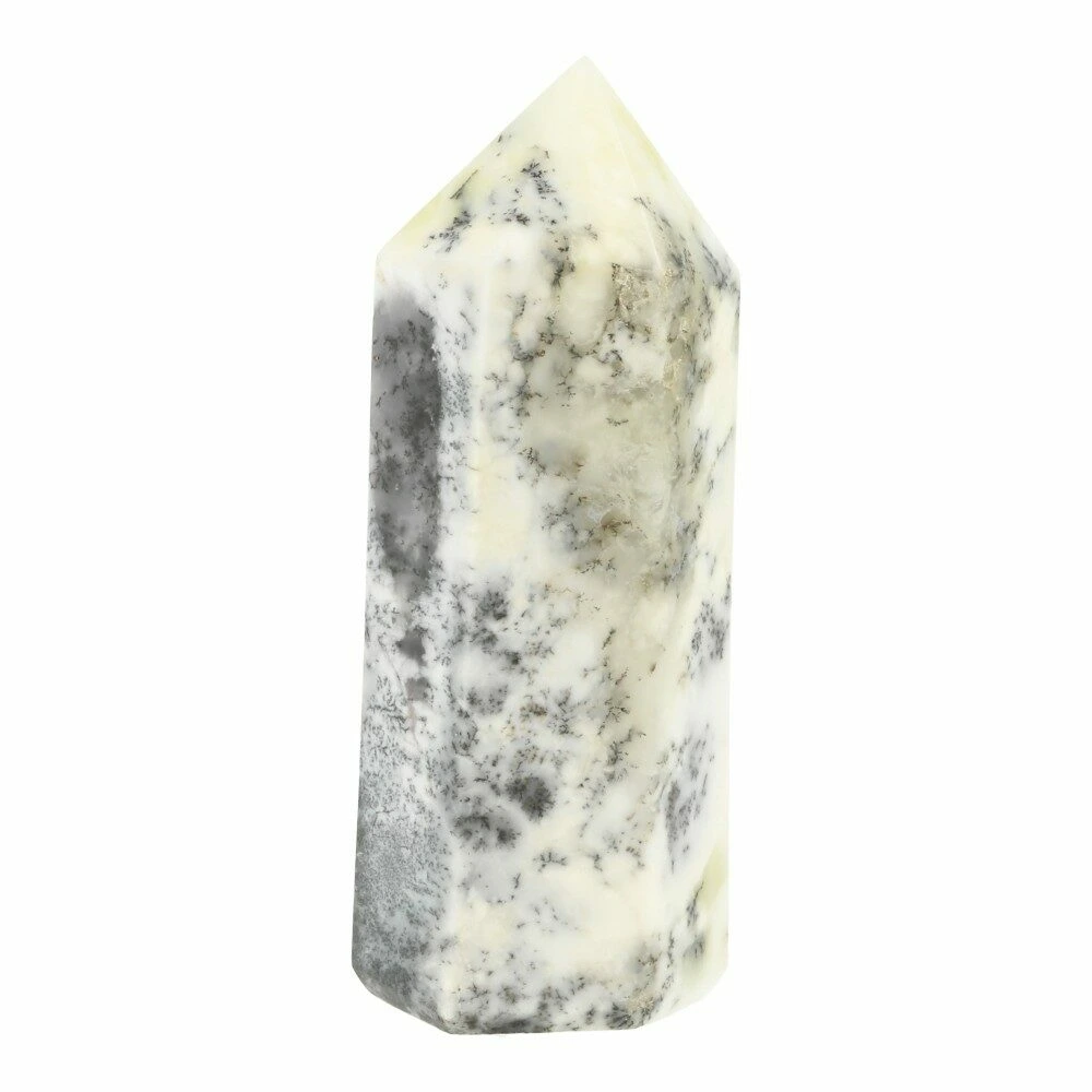 Fijne dendriet opaal toren of geslepen punt van ongeveer 13cm hoog met een basis van 4,5 x 4,5cm. Dendriet opaal is een witte opaalsoort met grijs-zwarte aders of dendrieten. Je ontvangt de dendriet opaal toren van de foto.