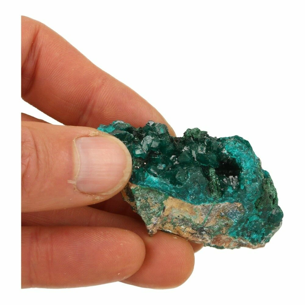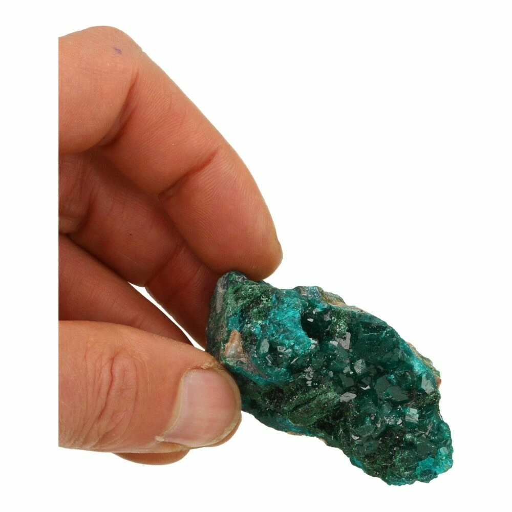 Fraai A-kwaliteit cluster heldergroene dioptaas ruw op moedergesteente. Een bijzonder fraai stukje heldere dioptaas met grote en kleine kristallen, gedeeltelijk overgroeid met malachiet. De afmeting van dit stuk dioptaas is ongeveer 6,5cm lang, 3cm breed en 2,8cm hoog en dit fraaie stuk komt uit Congo. Unieke dioptaas ruw van hoge kwaliteit! De energie is zacht en nederig, ze nodigt je op vriendelijke wijze uit om mee op innerlijke reis te gaan. Te voelen wat er te voelen is en daarmee los te laten wat je niet meer dient. Hierdoor een mooie aanvulling voor meditatie, op een altaar of krachtvoorwerp.