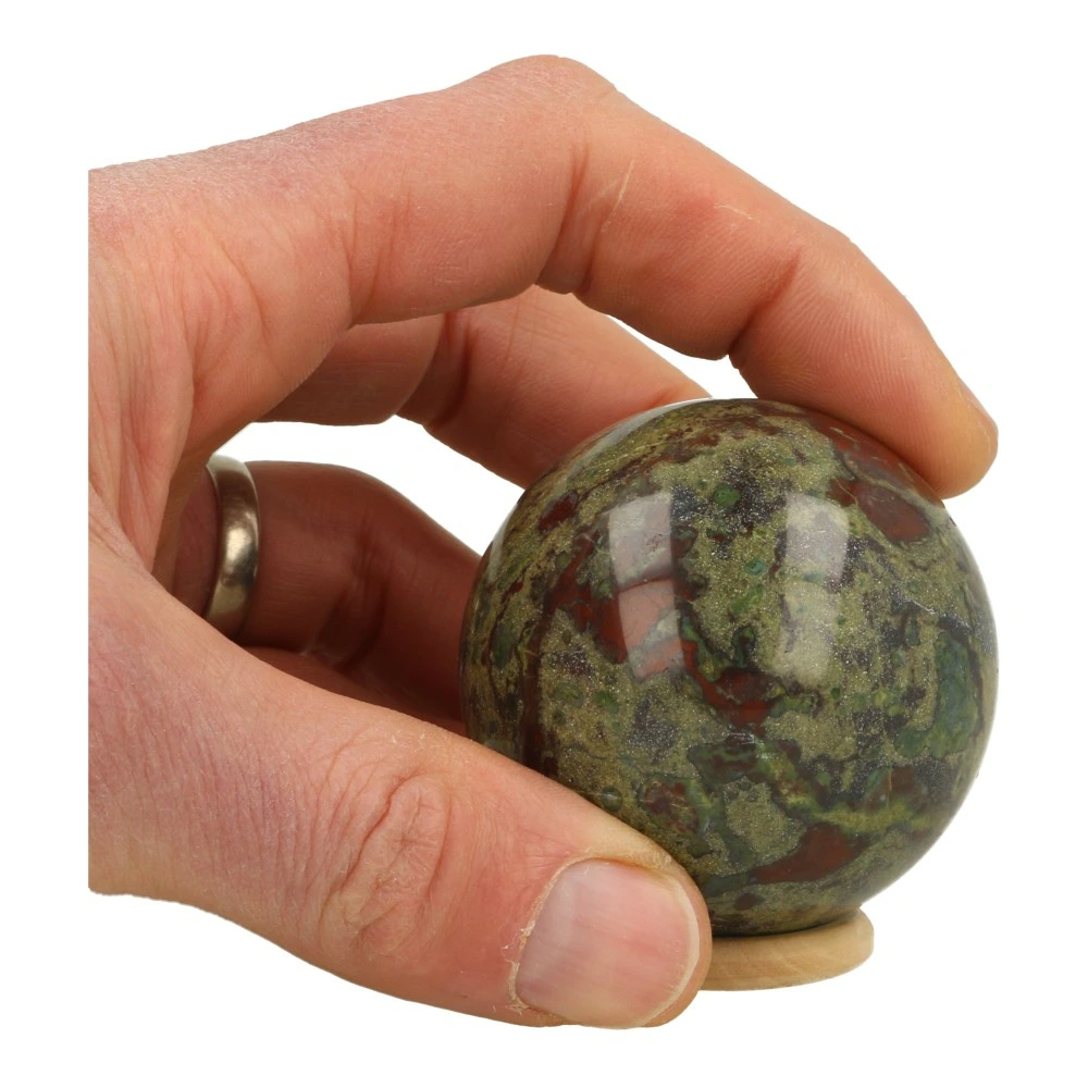 Fraai getekende drakenbloedsteen bol met diameter van circa 56mm op houten ring. Drakenbloedsteen heet ook wel Dragon Stone in het Engels. Je ontvangt de drakenbloedsteen bol van de foto.