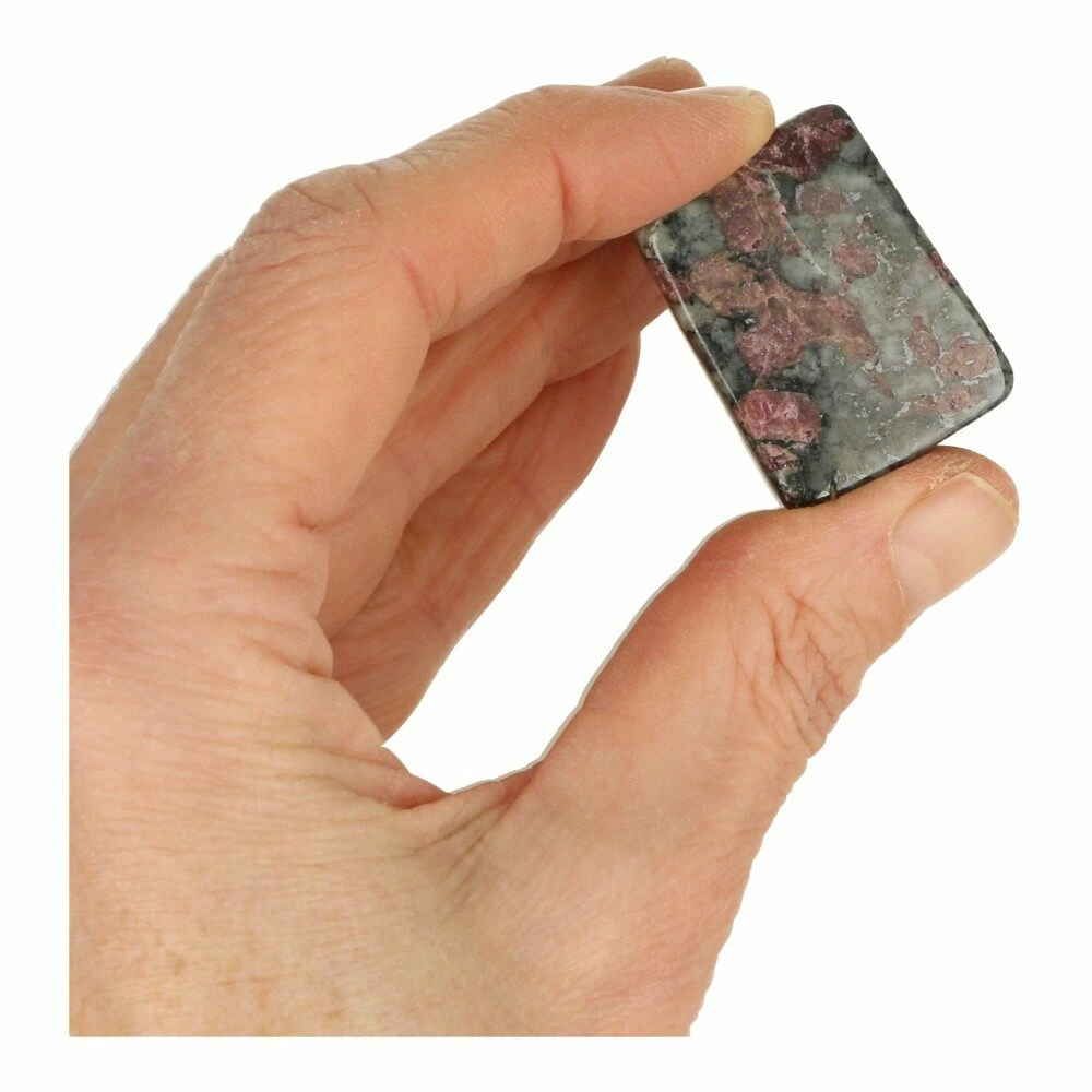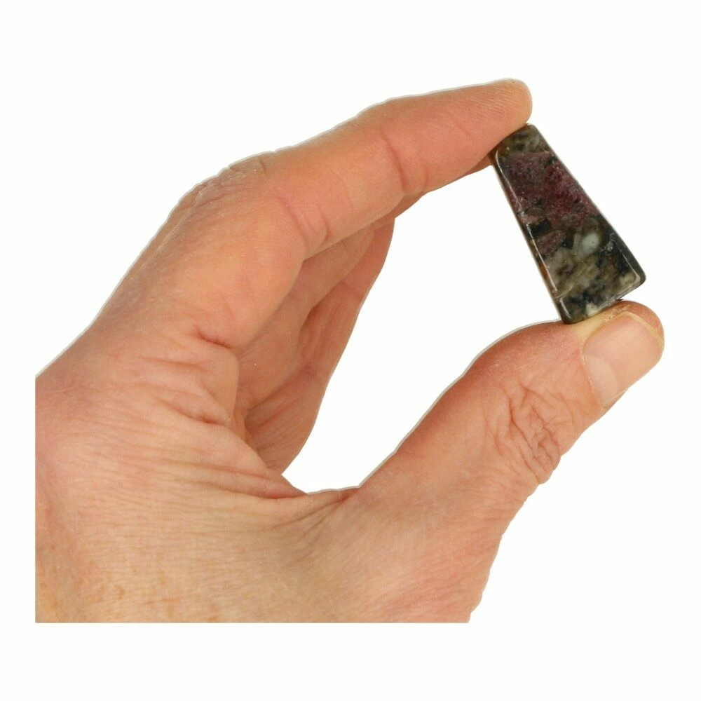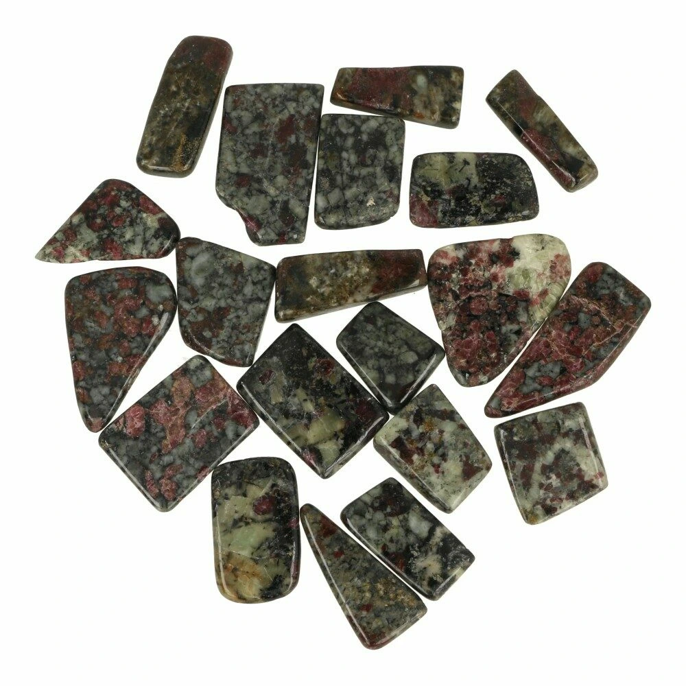 Fraaie eudialiet trommelsteen plat van ongeveer 5-7mm dik. De afmeting en vorm wisselt iets onderling en is ongeveer 2,5-4cm hoog en 1-2,5cm breed. Je ontvangt een soortgelijke eudialiet trommelsteen als op de foto.