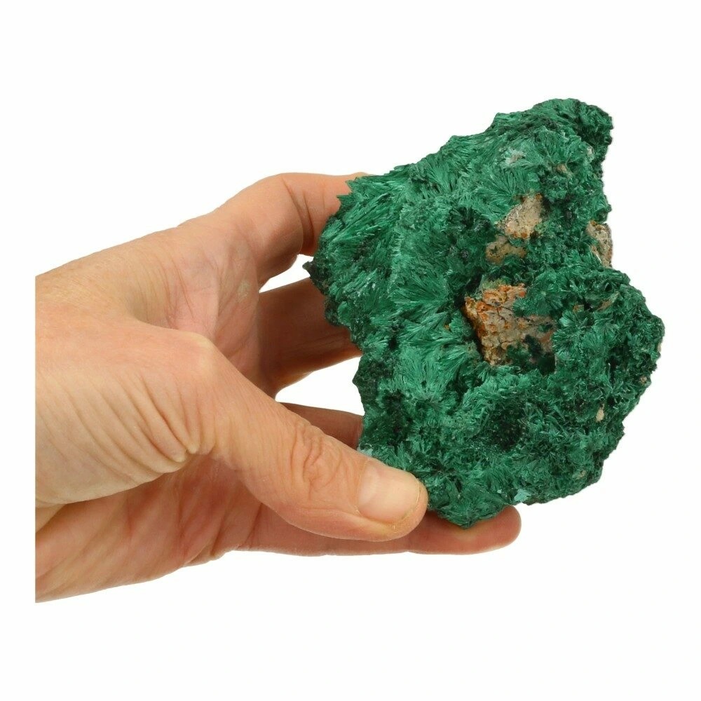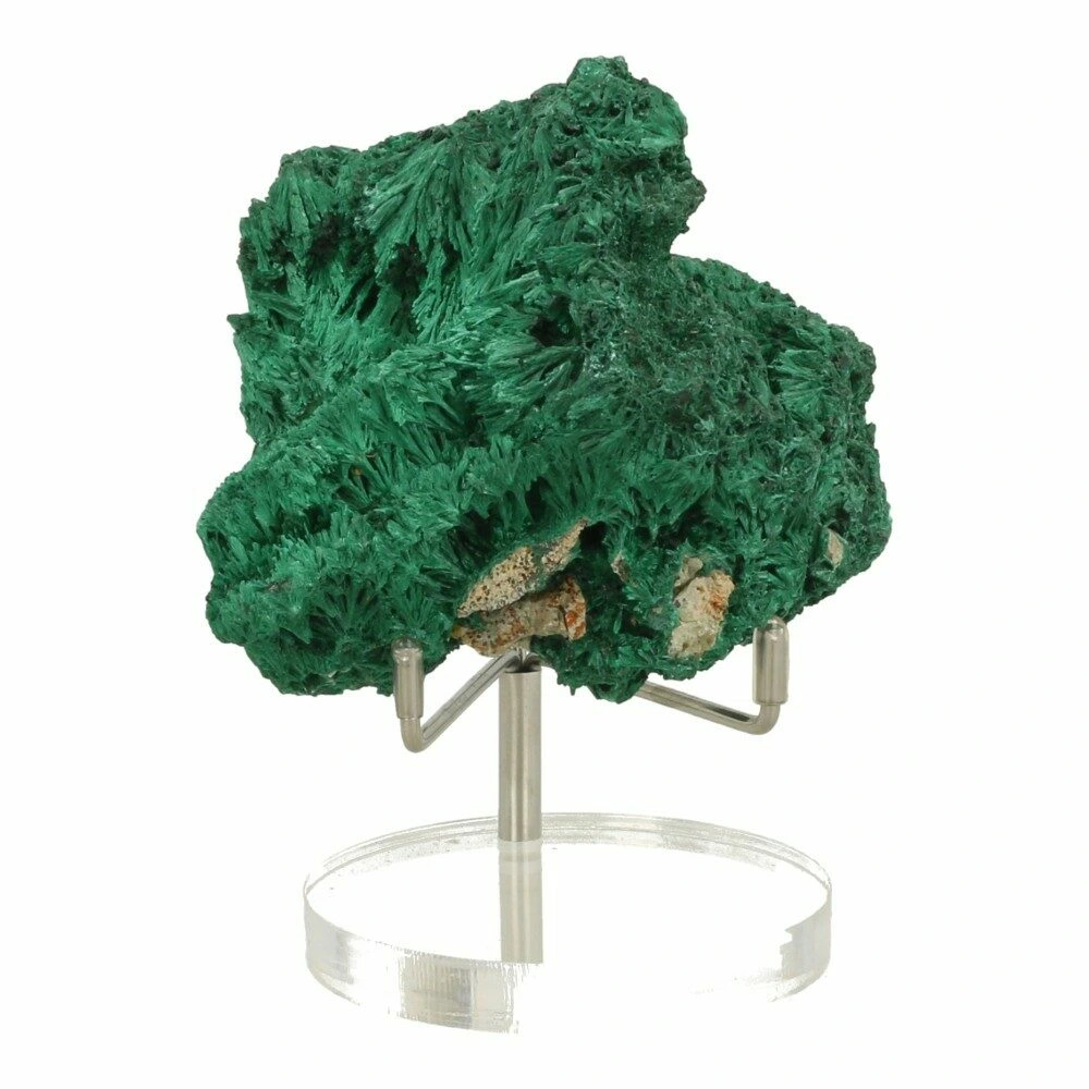 Prachtige diepgroene fluwelen malachiet ruw ‘nr7’ uit Democratische Republiek Congo op plexiglas standaard. We hebben een aantal van deze unieke stukken fluwelen malachiet kunnen bemachtigen met heldergroene malachiet naaldjes op bruin moedergesteente. De schittering van de naaldjes varieert met de lichtinval en is in het echt nog veel mooier. Dit stuk heeft twee compleet verschillende zijdes, beide prachtig schitterend in het licht. De afmeting van dit fraaie stuk fluwelen malachiet is ruim 9cm breed, 6,5cm diep en 10cm hoog (inclusief standaard). Je ontvangt de fluwelen malachiet op standaard van de foto’s.