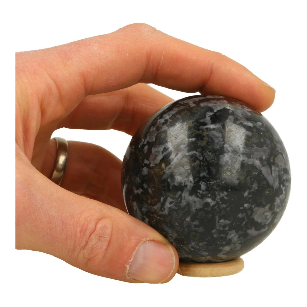 Mooi formaat Gabbro bol met een diepe, gelaagde werking. Deze stevige bol heeft een diameter van circa 66mm. Je ontvangt de bol van de foto met houten ringetje.