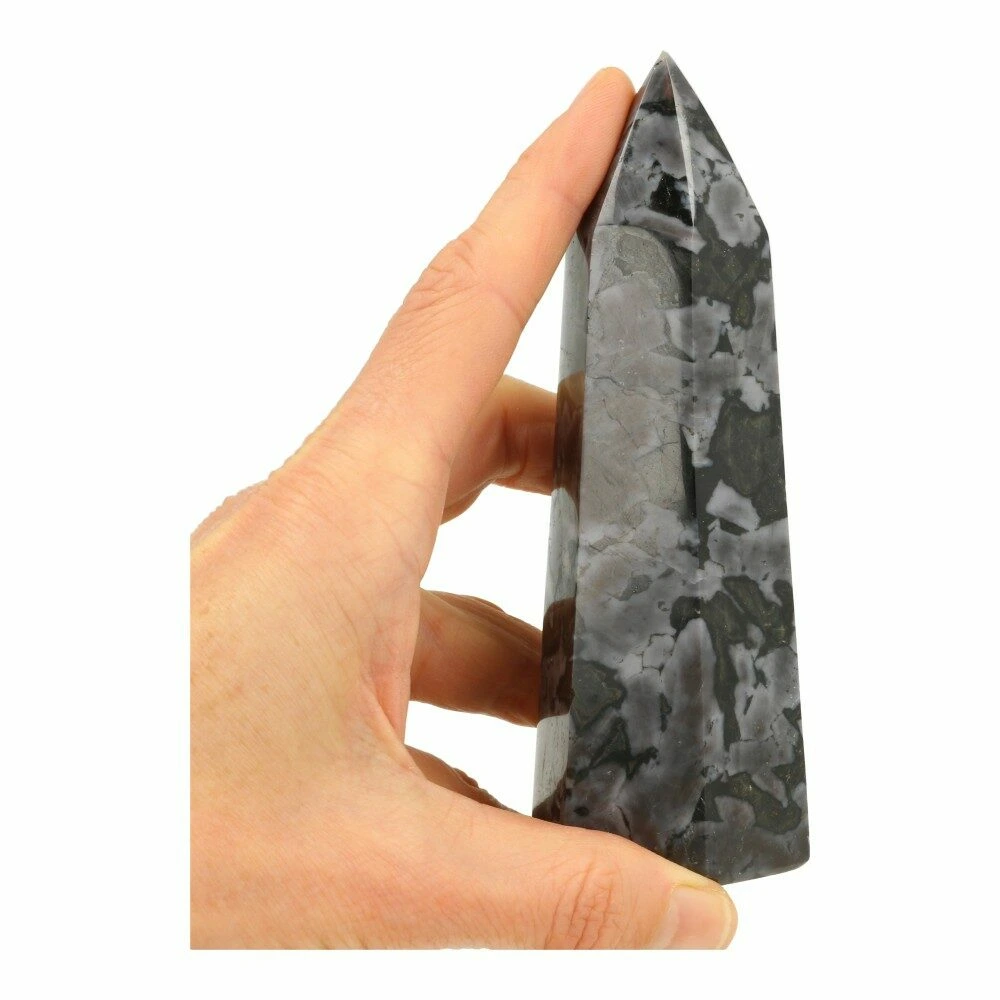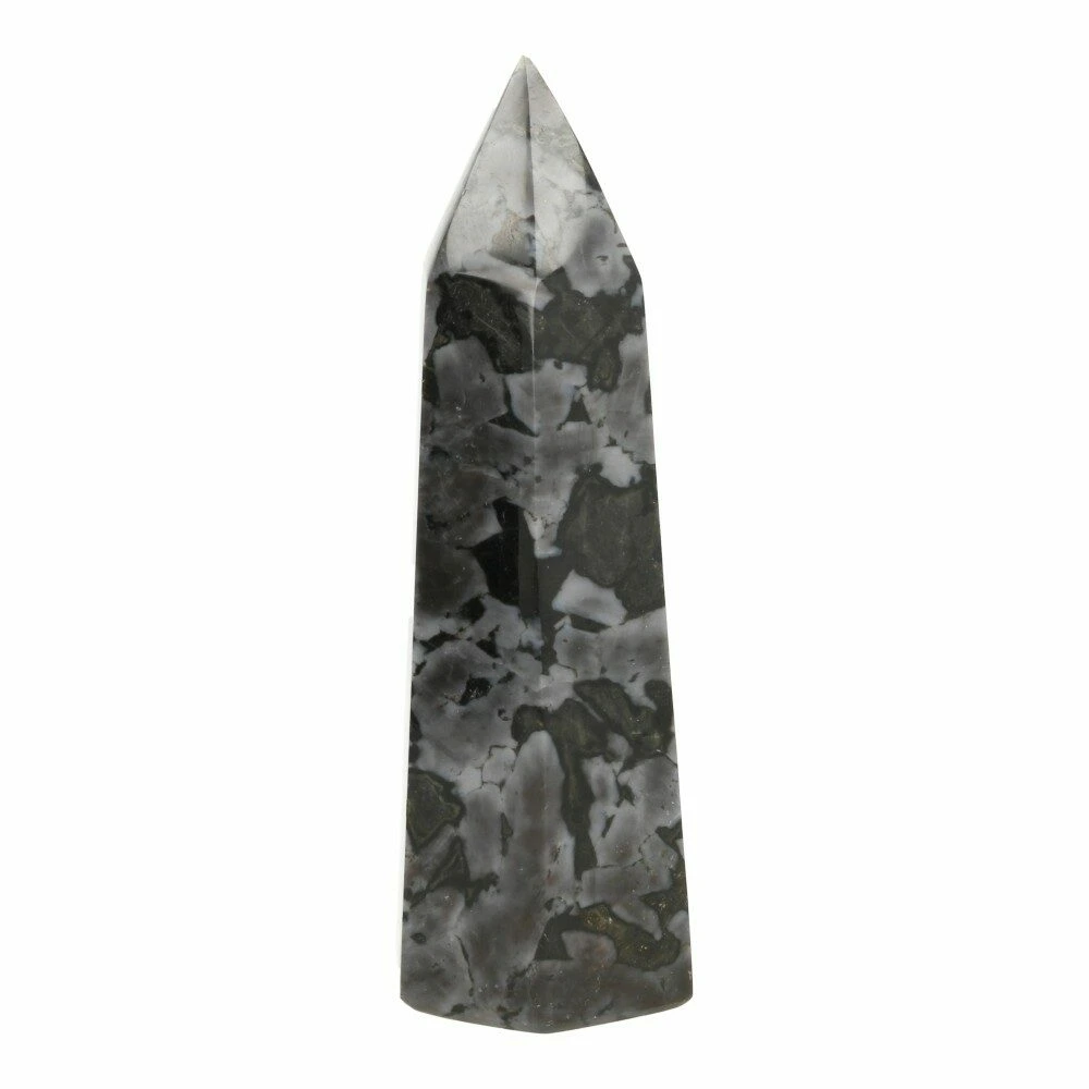 Fraaie gabbro toren of geslepen punt van 137mm hoog en een basis van 4 x 4cm en zes zijdes. Je ontvangt de gabbro toren van de foto. Gabbro staat ook bekend als ‘mystiek merliniet’.