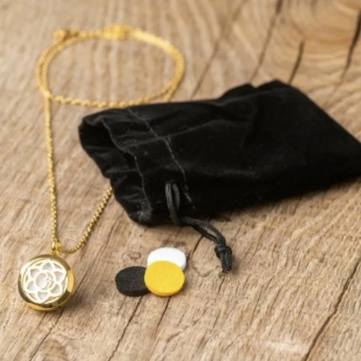 De Calicéa geurhanger bestaat uit een goudkleurig roestvrijstalen medaillon met een bijpassende ketting van 70 cm. In het medaillon plaats je een van de meegeleverde vilten pads. Hierop druppel je eenvoudig een paar druppels essentiële olie of een geurmengsel naar keuze.