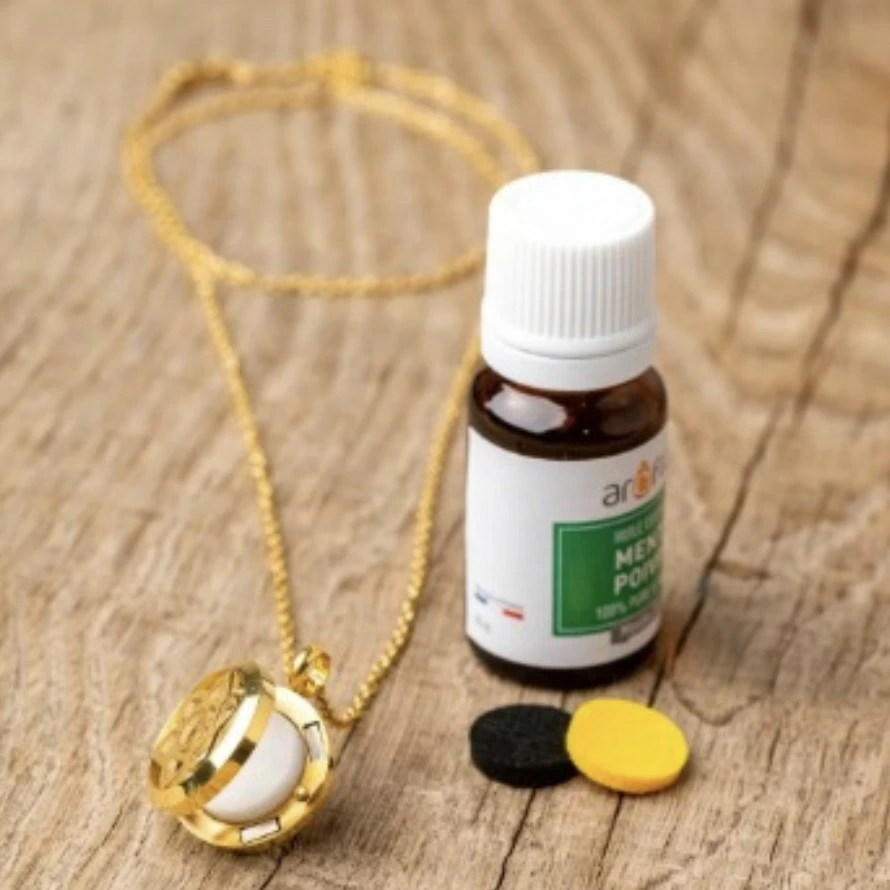 Goudkleurig medaillon voor etherische olie. Wil je de kracht van essentiële oliën altijd bij je dragen, op een subtiele en stijlvolle manier? De Calicéa geurhanger van Innobiz is een elegante aromatherapie hanger waarmee je de hele dag door kunt genieten van jouw favoriete geur, zonder direct huidcontact met de olie.
