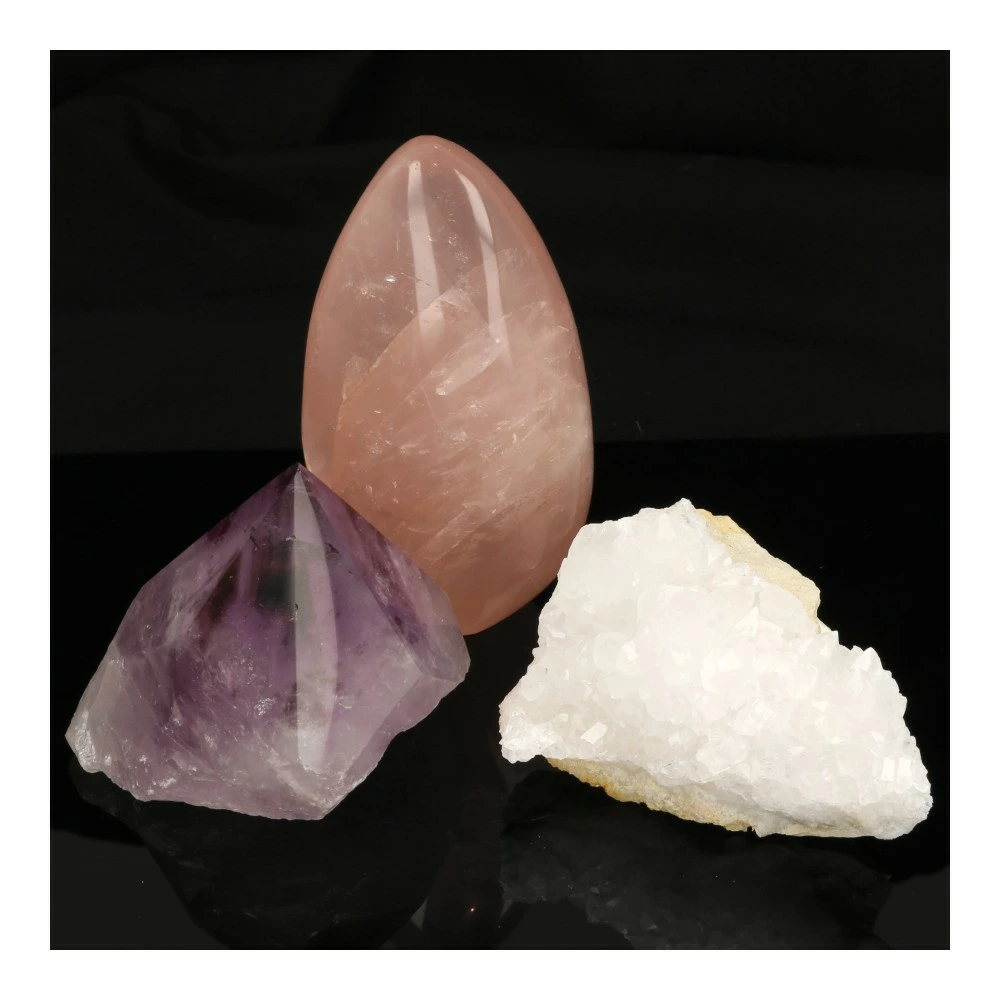 | Naam | Amethist, Bergkristal, Gouden driehoek, Rozenkwarts |
